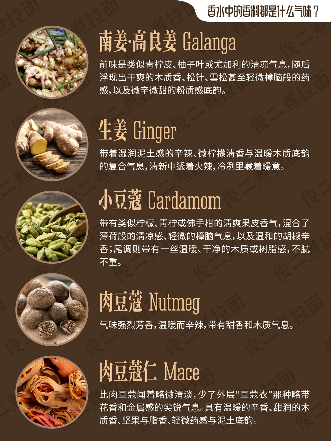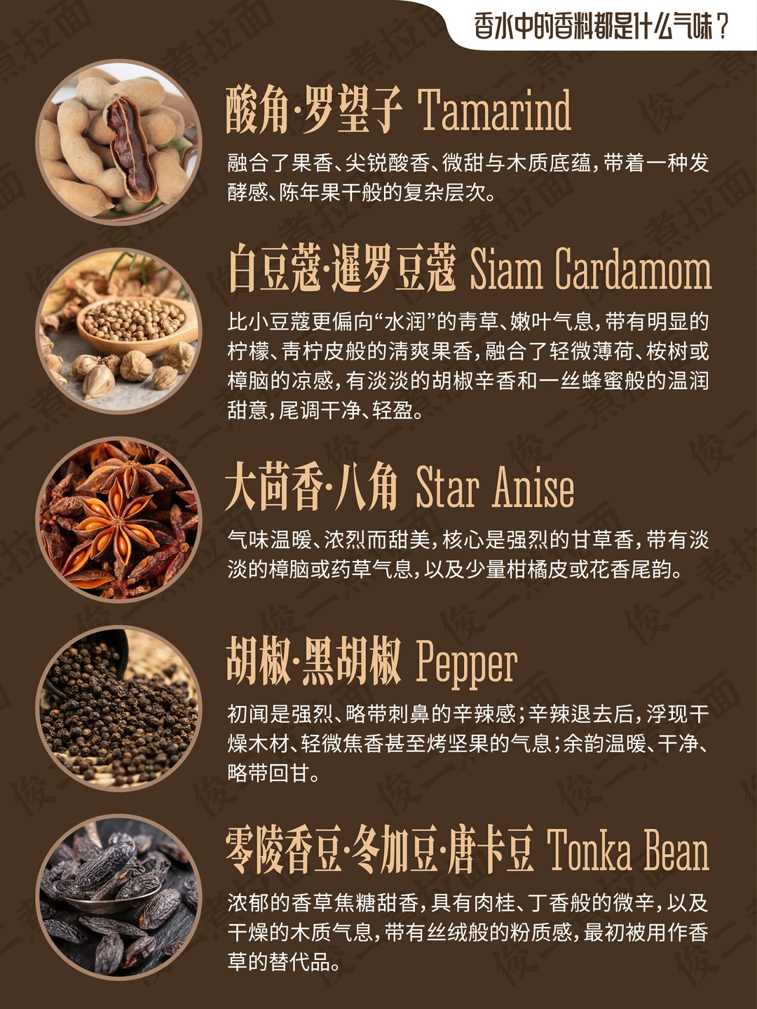 本期香料名录: 生姜 小茴香 大茴香·八角 葛缕子 桂皮 肉桂 孜然 胡椒·黑胡椒 粉红胡椒 刺椒·胡椒木 小豆蔻 白豆蔻·暹罗豆蔻 肉豆蔻 肉豆蔻仁 百里香 公丁香 零陵香豆 阿魏 姜黄 芝麻 葫芦巴 酸角·罗望子 南姜·高良姜 帖木儿 多香果 玉桂子 陈皮 山苍子 决明子 咖喱 奇亚籽 川芎 .