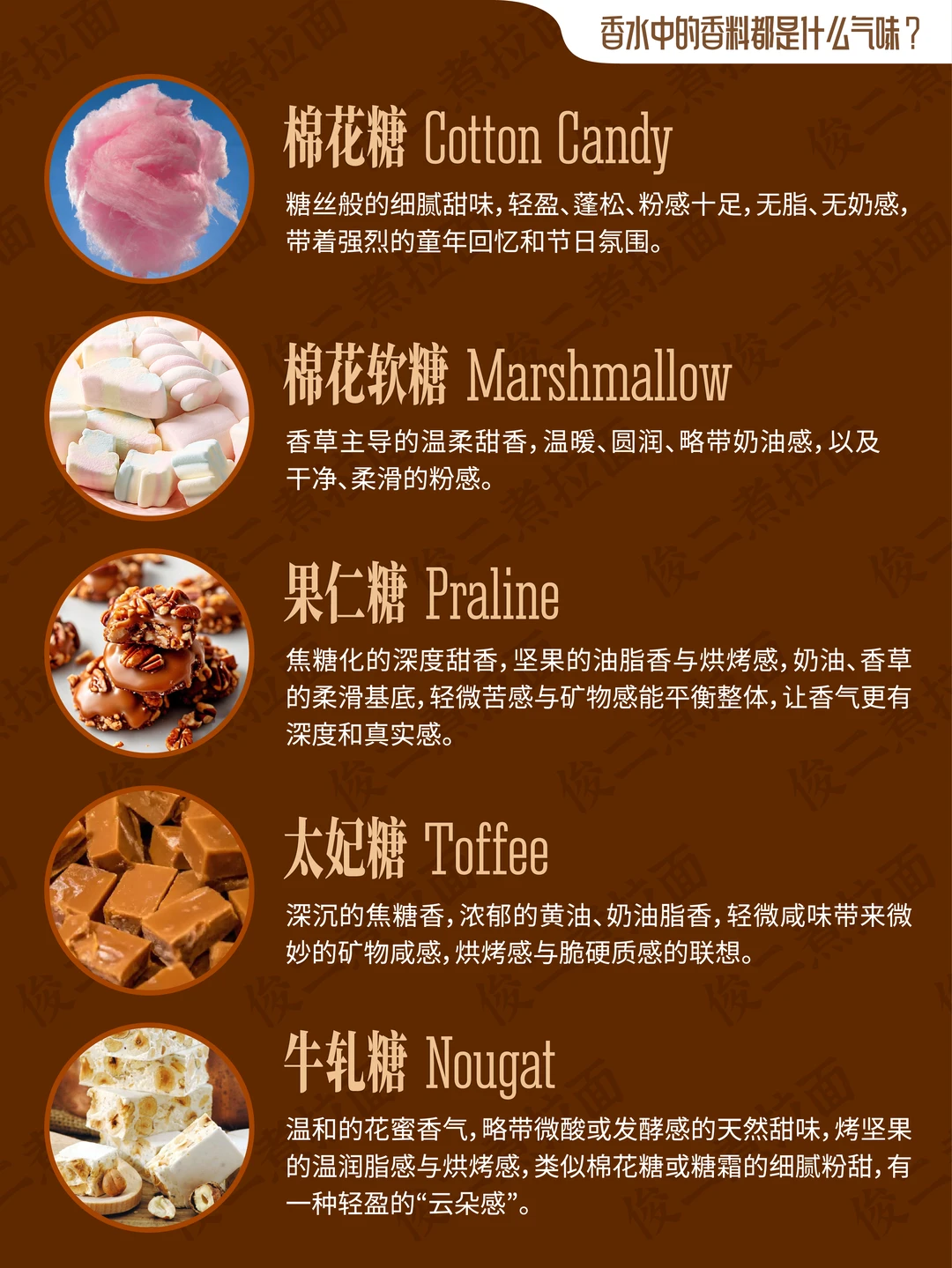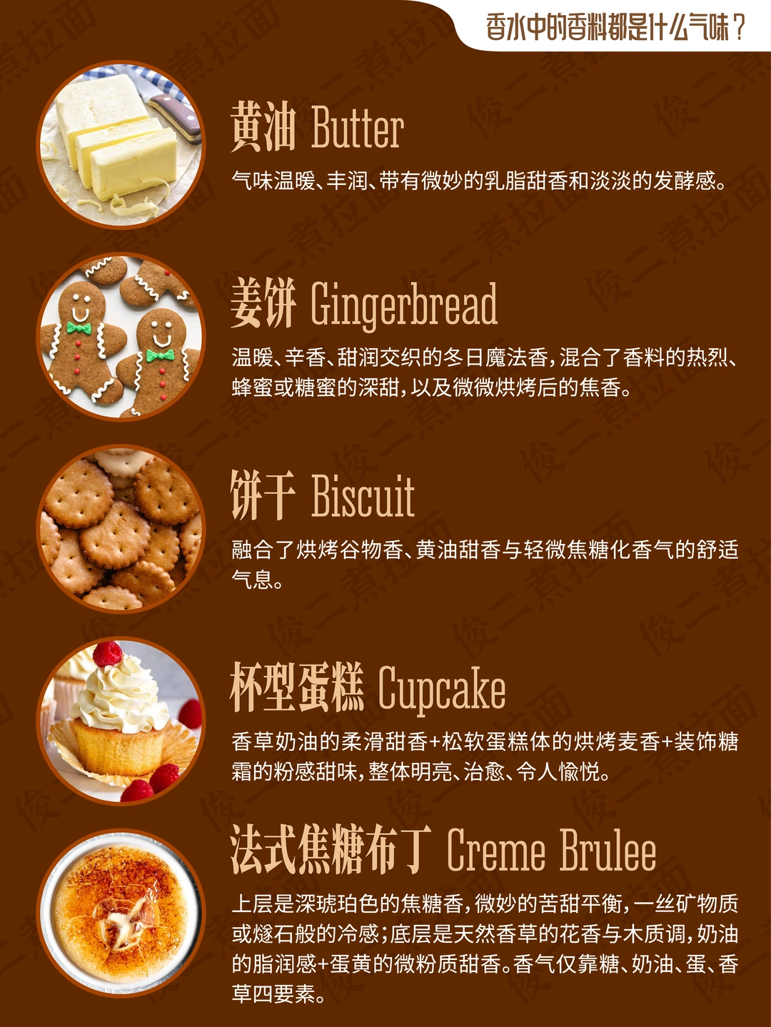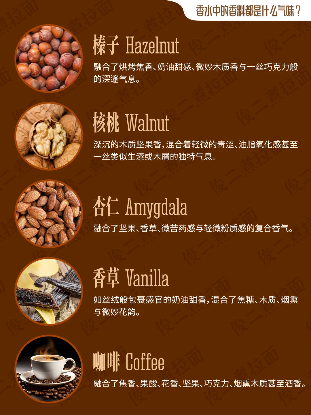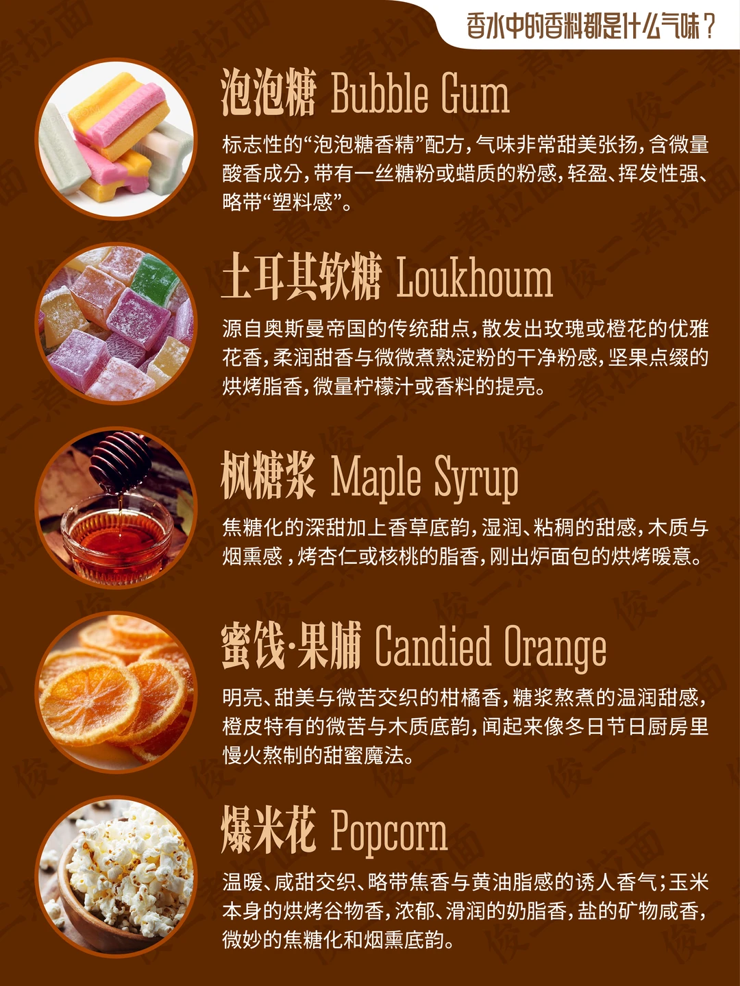 本期香料名录: 榛子 核桃 杏仁 香草 咖啡 牛奶 奶黄 奶油 冰激凌 雪芭冰激凌 黑巧克力 白巧克力 焦糖 红糖 糖果 棉花糖 棉花软糖 果仁糖 太妃糖 牛轧糖 泡泡糖 土耳其软糖 枫糖浆 蜜饯·果脯 爆米花 黄油 姜饼 饼干 杯型蛋糕 法式焦糖布丁 面包 大米 大麦 小麦 麦芽 大枣 杏仁糕 马卡龙 蛋白糖饼 曲奇 茶叶 抹茶 马黛茶 伯爵茶 茉莉花茶 苦艾酒 朗姆酒 莫吉托 干邑白兰地 红酒 白葡萄酒 香槟 威士忌 杜松子酒 烈酒 .