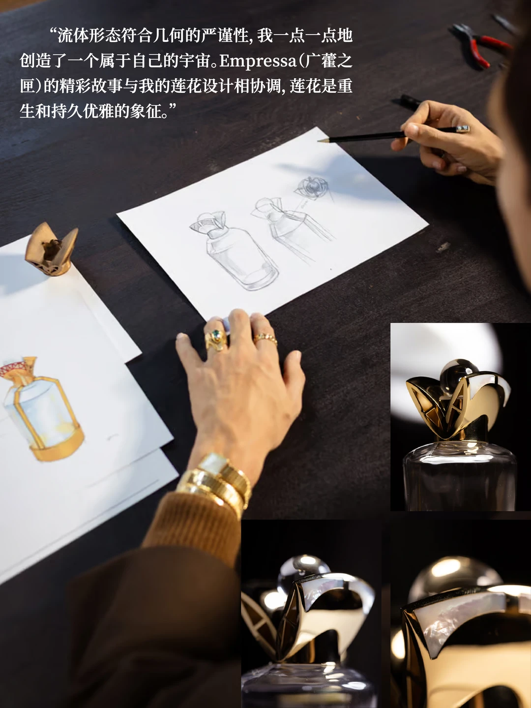 🪷“流体形态符合几何的严谨性,我一点一点地创造了一个属于自己的宇宙。Empressa(广藿之匣)的精彩故事与我的莲花设计相协调,莲花是重生和持久优雅的象征。”—— Dries Criel