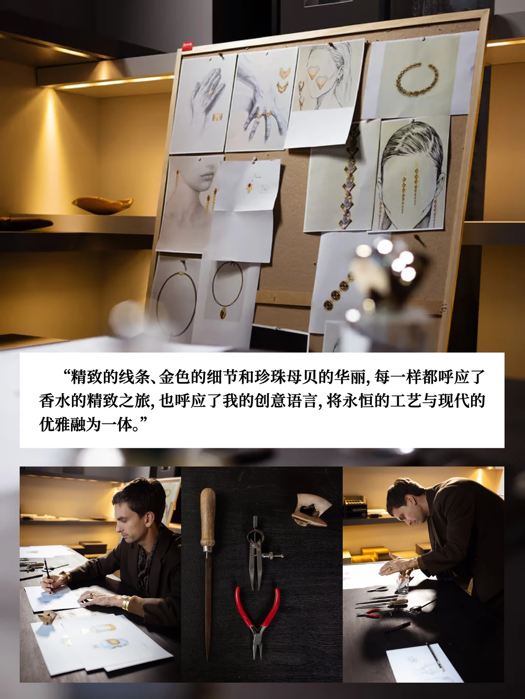 💫“精致的线条、金色的细节和珍珠母贝的华丽,每一样都呼应了香水的精致之旅,也呼应了我的创意语言,将永恒的工艺与现代的优雅融为一体。”—— Dries Criel