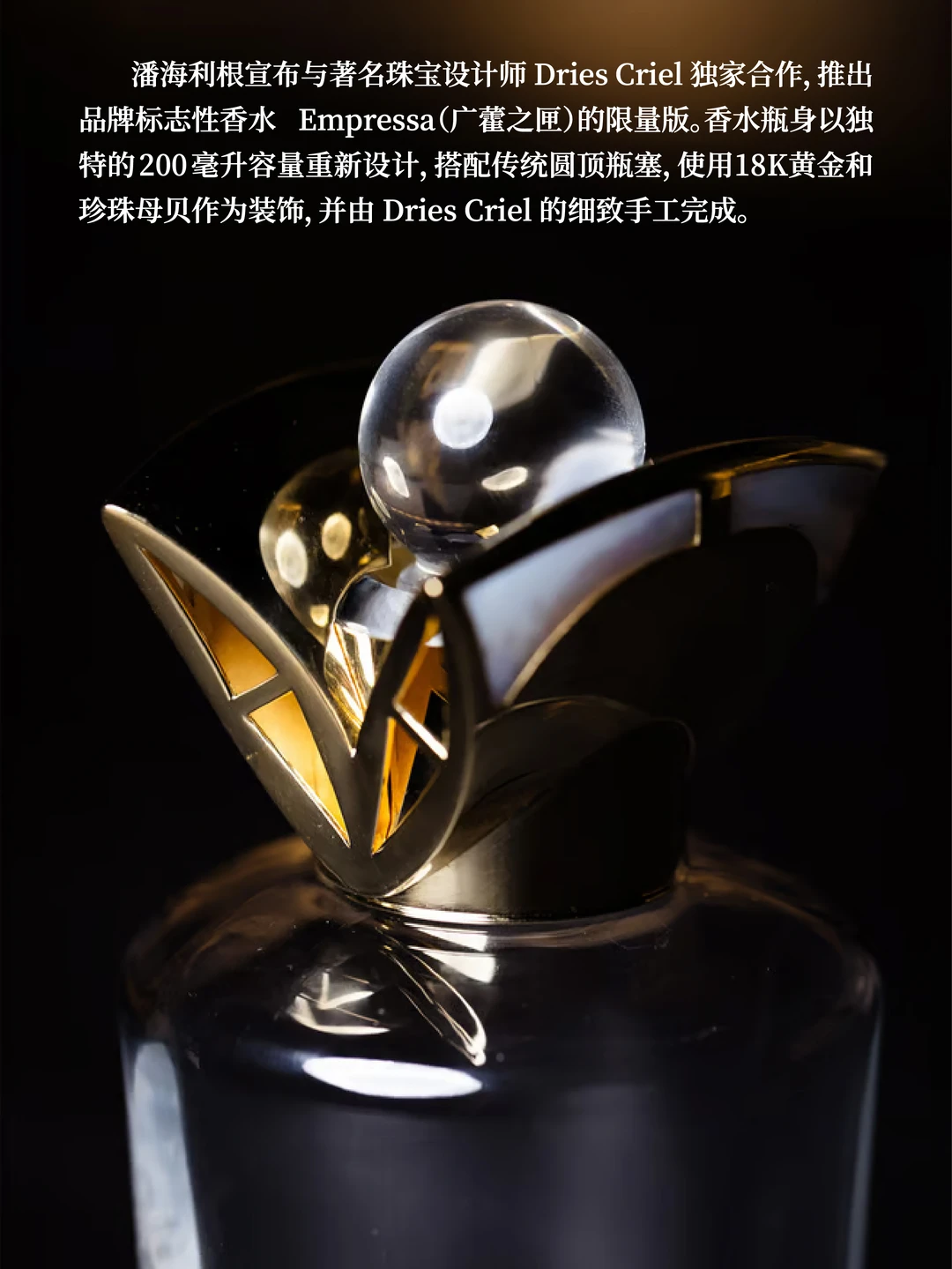 🇬🇧 潘海利根宣布与著名珠宝设计师 Dries Criel 独家合作,推出品牌标志性香水 Empressa(广藿之匣)的限量版。香水瓶身以独特的200毫升容量重新设计,搭配传统瓶塞,使用18K黄金和珍珠母贝作为装饰,并由 Dries Criel 的细致手工完成。