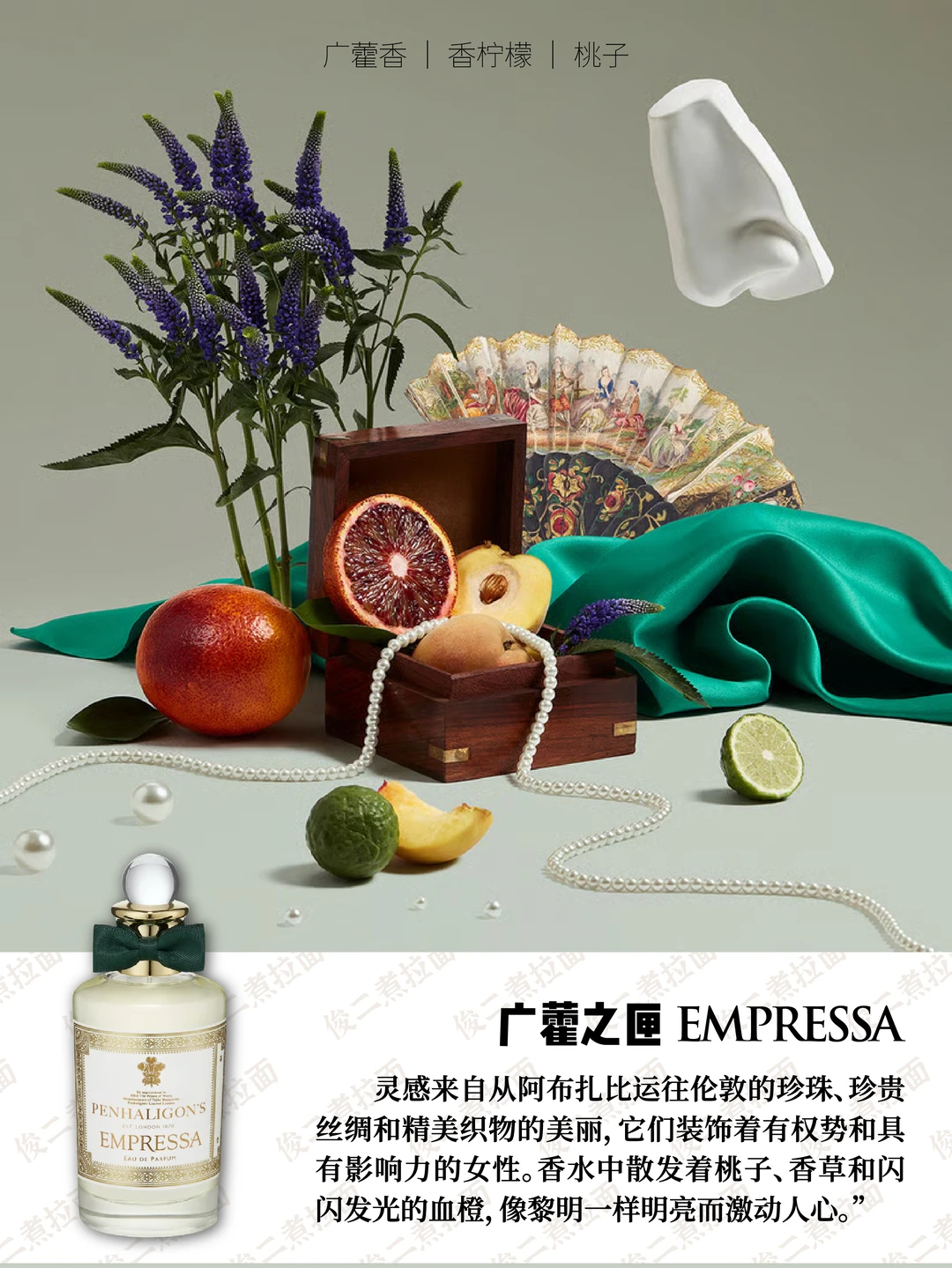 🔮 Empressa(广藿之匣)灵感来自从阿布扎比运往伦敦的珍珠、珍贵丝绸和精美织物的美丽,它们装饰着有权势和具有影响力的女性。香水中散发着桃子、香草和闪闪发光的血橙,像黎明一样明亮而激动人心。”