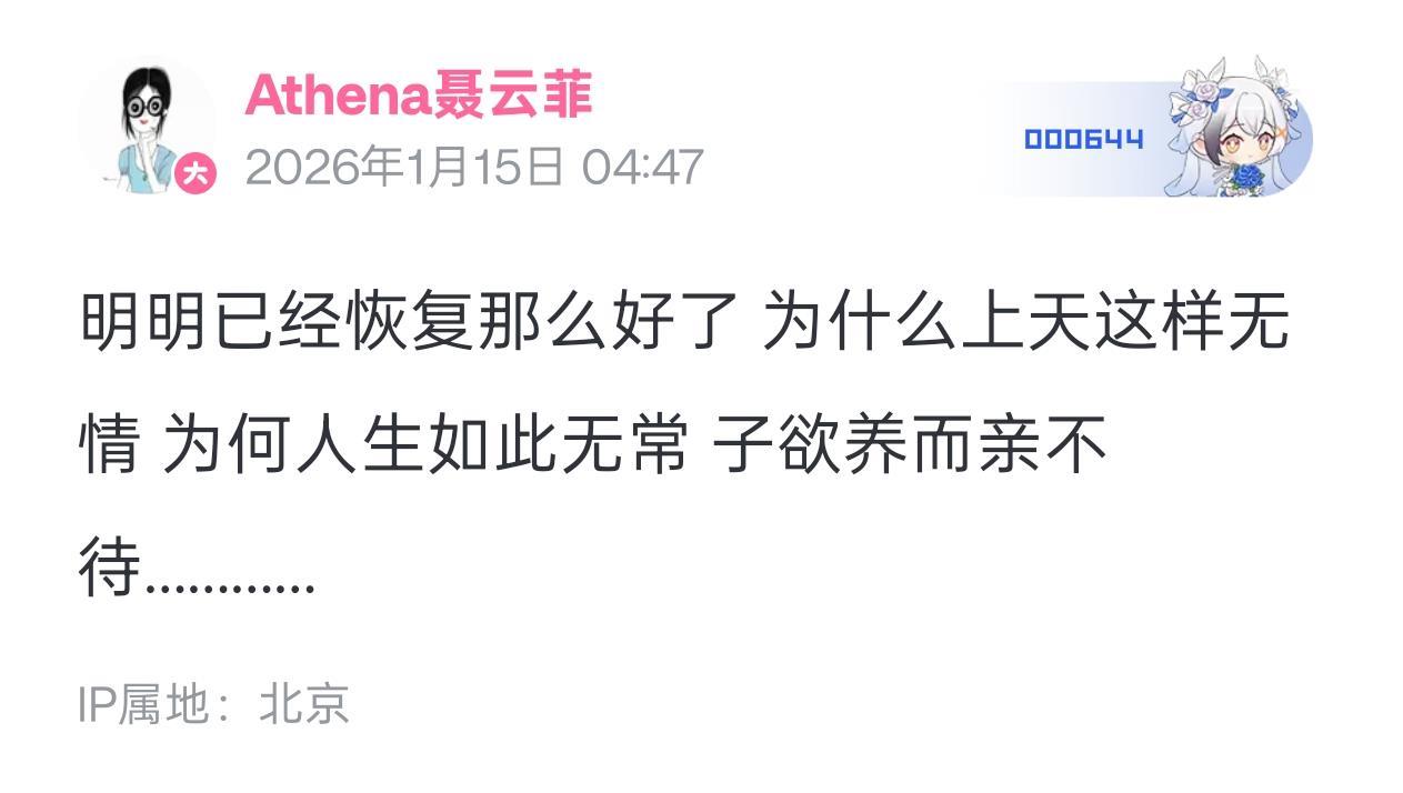 1月15日凌晨,聂卫平女儿聂云菲在个人账号发文悼念:“明明已经恢复那么好了为什么上天这样无情为何人生如此无常子欲养而亲不待…………”