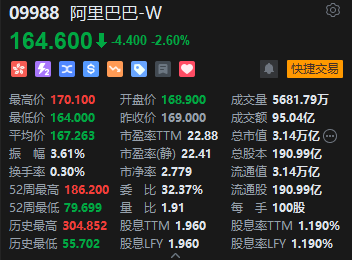 阿里巴巴港股股价回落,跌近3%,触及164港元,此前一度转涨;美股夜盘跌近1%,此前一度涨超2%。截至发文,阿里巴巴跌2.6%,成交额逾95亿港元。