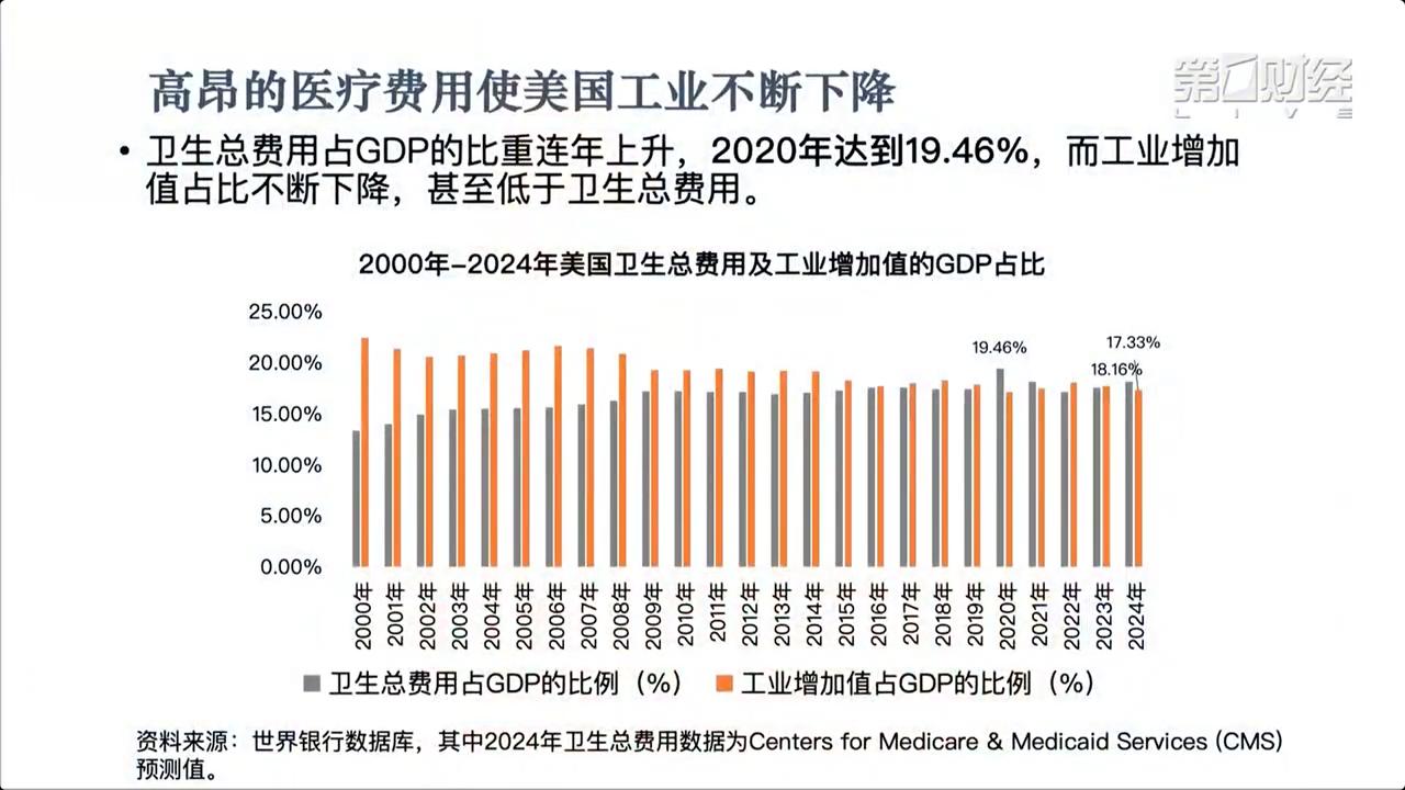 1月15日,在2025新浪金麒麟论坛上,北京大学国家发展研究院教授李玲表示,高昂的医疗费用使美国工业不断下降。 她进一步表示,美国卫生总费用占GDP的比重连年上升,2020年达到19.46%,而工业增加值占比不断下降,甚至低于卫生总费用。美国现在的人均医疗费用是15000美元,非常高昂。