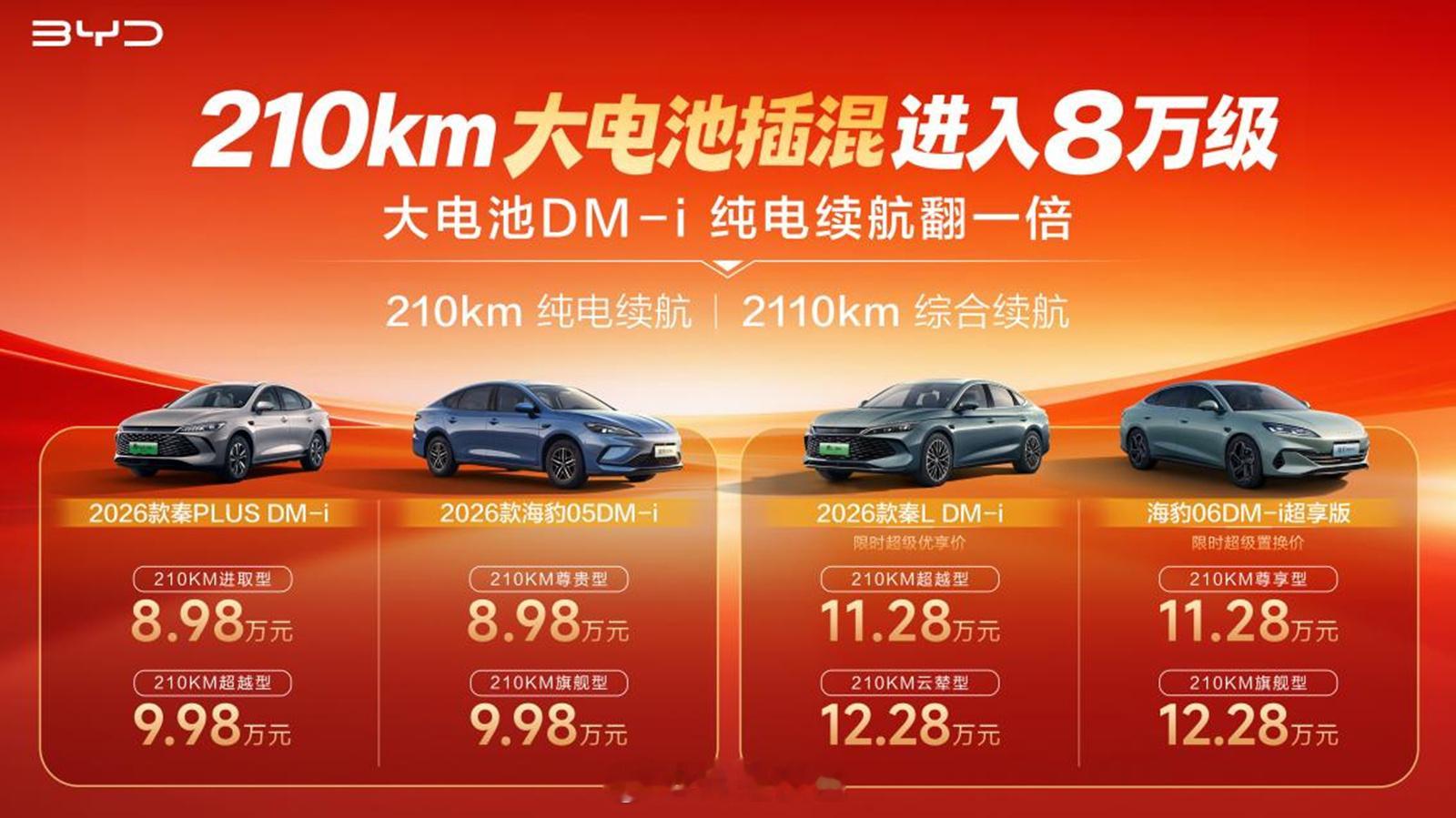 你想要的大电池DM-i来了大电池DM-i纯电续航翻一倍 8万级市场风云突变,插混电力再加码,比亚迪“逆周期”操作藏着什么秘密?在全球新能源汽车产业蓬勃发展的当下,电池原材料价格上涨、电池供不应求已成为行业面临的严峻挑战。然而,比亚迪却以“逆周期”操作惊艳市场——将搭载突破210km纯电续航的大电池DM-i车型推至8万级市场,插混电力再加码,引领新能源汽车发展新趋势。在A级家轿市场,2026款秦PLUS DM-i和海豹05 DM-i的210km版本,官方指导价为8.98 - 9.98万元。以往在这个价位,消费者只能买到纯电续航110km左右的版本,而比亚迪直接将长续航打入核心腹地,让同价位的竞品瞬间显得“续航短板”。在中级轿车市场,2026款秦L DM-i和海豹06 DM-i超享版,210km版本指导价为11.68 - 12.68万元,并且还有限时优惠活动。这等于用合资品牌A级燃油车的价格,提供了一台B级尺寸、续航超2110公里、且配置拉满的插混车。比亚迪通过“逆周期”策略,推出高续航插混车型,打破市场格局,真正践行了“让好技术人人可享”的理念,为消费者带来福音,也为行业发展树立了新标杆。比亚迪