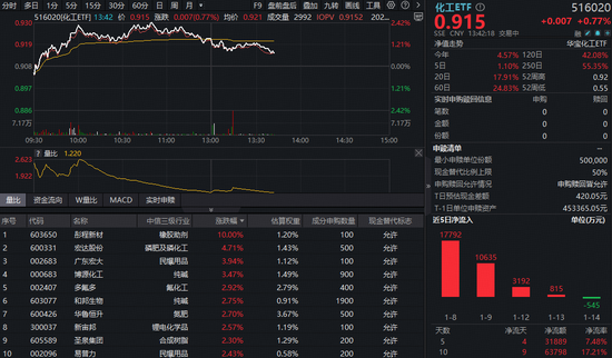 化工板块场内热门布局工具化工ETF(516020)亦吸金不断。交易所数据显示,截至昨日(1月14日),化工ETF(516020)近5个交易日中有4个交易日获资金净申购,合计净申购额超过3.1亿元;近10个交易日,化工ETF(516020)累计吸金额更是超过6.3亿元。