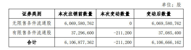 本次注销完成后,中国化学总股本将由6,106,877,362股变更为6,106,666,162股。
