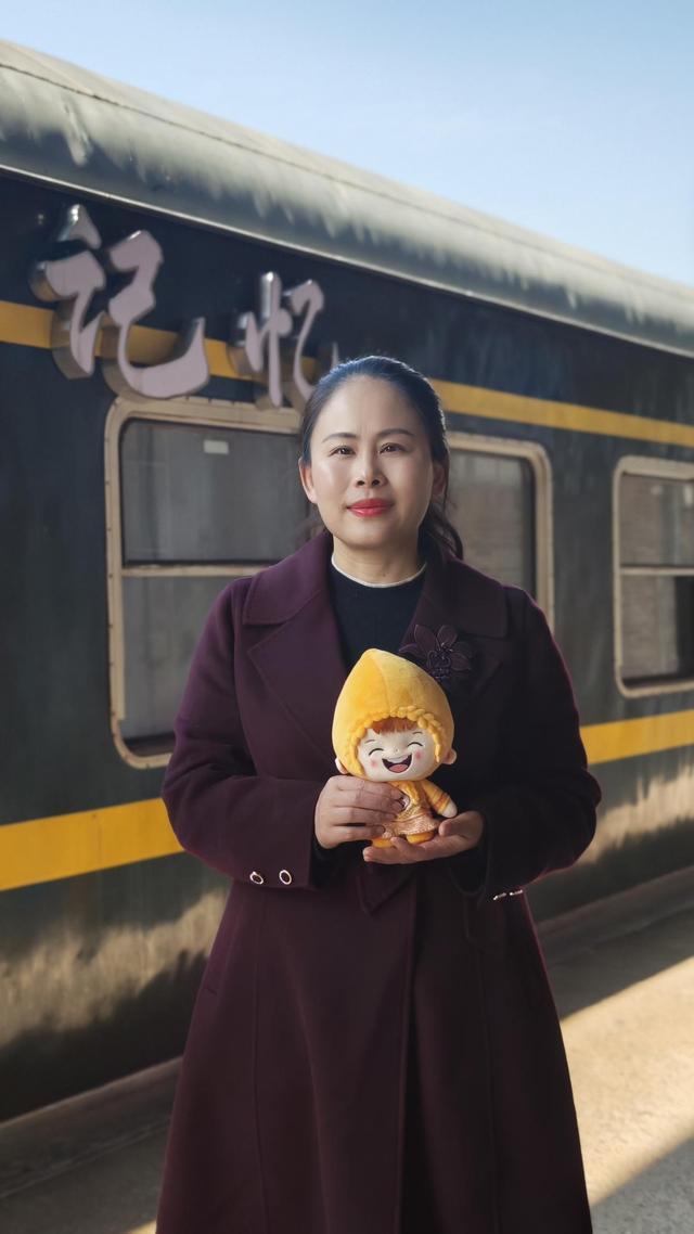 (金建平手捧“福满满”玩偶,站在怀化图博馆展厅外的火车站站台)