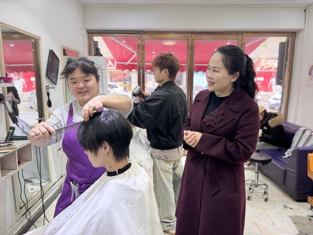 (金建平在“理发师晓华”店里与晓华互动交谈,了解其店铺运营发展情况)