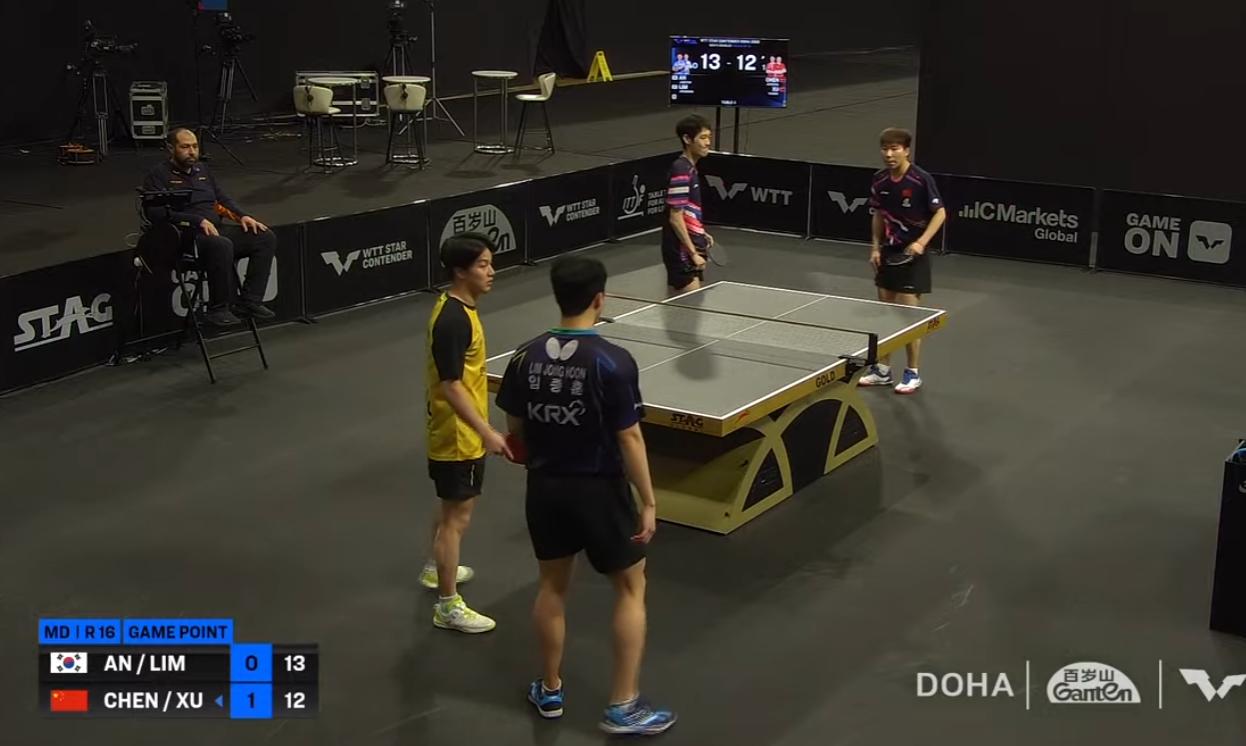 哈哈,关键时刻,徐瑛彬没掉链子! 这次多哈球星赛 徐瑛彬/陈俊松打的这不错, 第一局11:8拿下安宰贤/林钟勋组合, 第二局两队又打到了10:10, 此时看出徐瑛彬心态来了, 陈俊松赚一分, 徐瑛彬丢一分, 不过最后两分, 徐瑛彬咬住了, 16:14再下一局 目前国乒2:0领先了,哈哈
