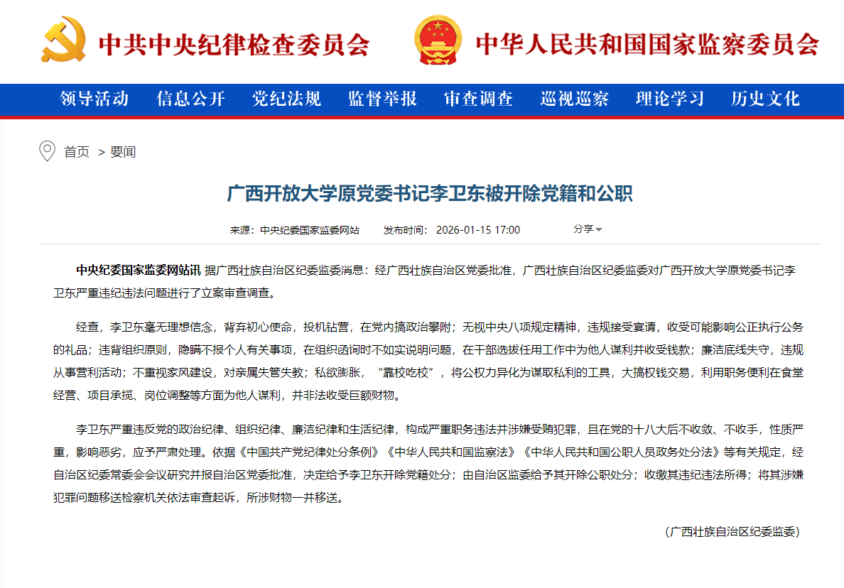 中央纪委国家监委网站讯据广西壮族自治区纪委监委消息:经广西壮族自治区党委批准,广西壮族自治区纪委监委对广西开放大学原党委书记李卫东严重违纪违法问题进行了立案审查调查。