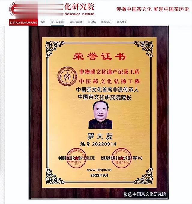 除了国家级中国茶文化首席非遗传承人、中国茶文化研究院院长两个身份,该网站以及公开信息还显示,“罗大友”是高级政工师;国务院侨务办及清华大学指定的茶文化讲座教授;中国亚太经济中心国际贸易部指定的“国礼茶技、茶文化首席鉴定师”及“国礼书画、国礼瓷器首席鉴定师”;张仲景博物院在册健康专家;央视中学生频道美育总顾问;美国巴拿马太平洋万国博览会终身评委兼中国区主席团主席等身份。