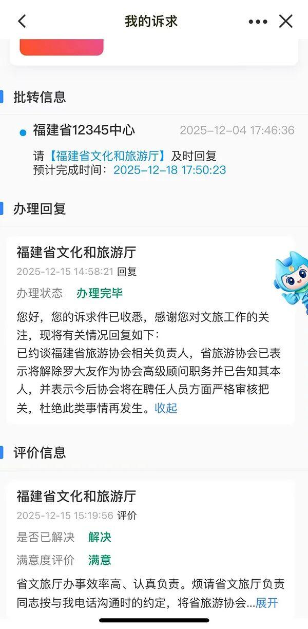 福建省文化和旅游厅在2025年12月15日回复李健称,已约谈该省旅游协会相关负责人,该协会已表示将解除罗大友作为协会高级顾问职务,并已告知其本人,并表示今后协会将在聘任人员方面严格审核把关,杜绝此类事情再发生。