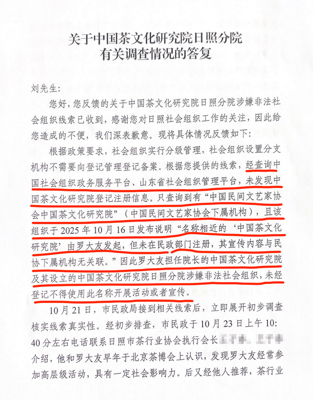日照市民政局于10月23日电话联系日照市茶行业协会执行会长王子春。王子春介绍,他和罗大友早年于北京茶博会上认识,发现罗大友经常参加高层级活动,具有一定社会影响力。后又经他人推荐,茶行业协会邀请罗大友来日照就茶文化授课,其间罗大友声称中国茶文化研究院是文化部下设的单位,其担任院长,并在日照设立了中国茶文化研究院日照分院。