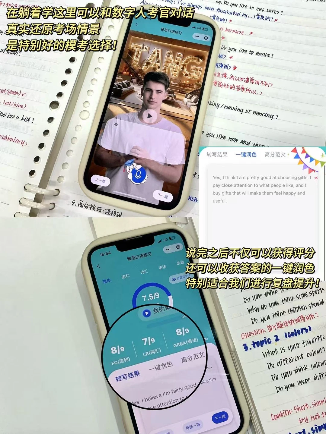🎉在记住了口语不同部分的表达技巧&回答逻辑后,我们就可以在躺着学小程序上进行真题模拟练习了🔜直接打开躺着学小程序,点进口语练习,选择你想要练习的Part然后根据数字人考官的问题进行回答就可以啦。回答完之后它会给你提供四个维度的分数评判(发音/词汇/流畅度/语法等)以及详细的批改修正意见和语言润色建议🥹