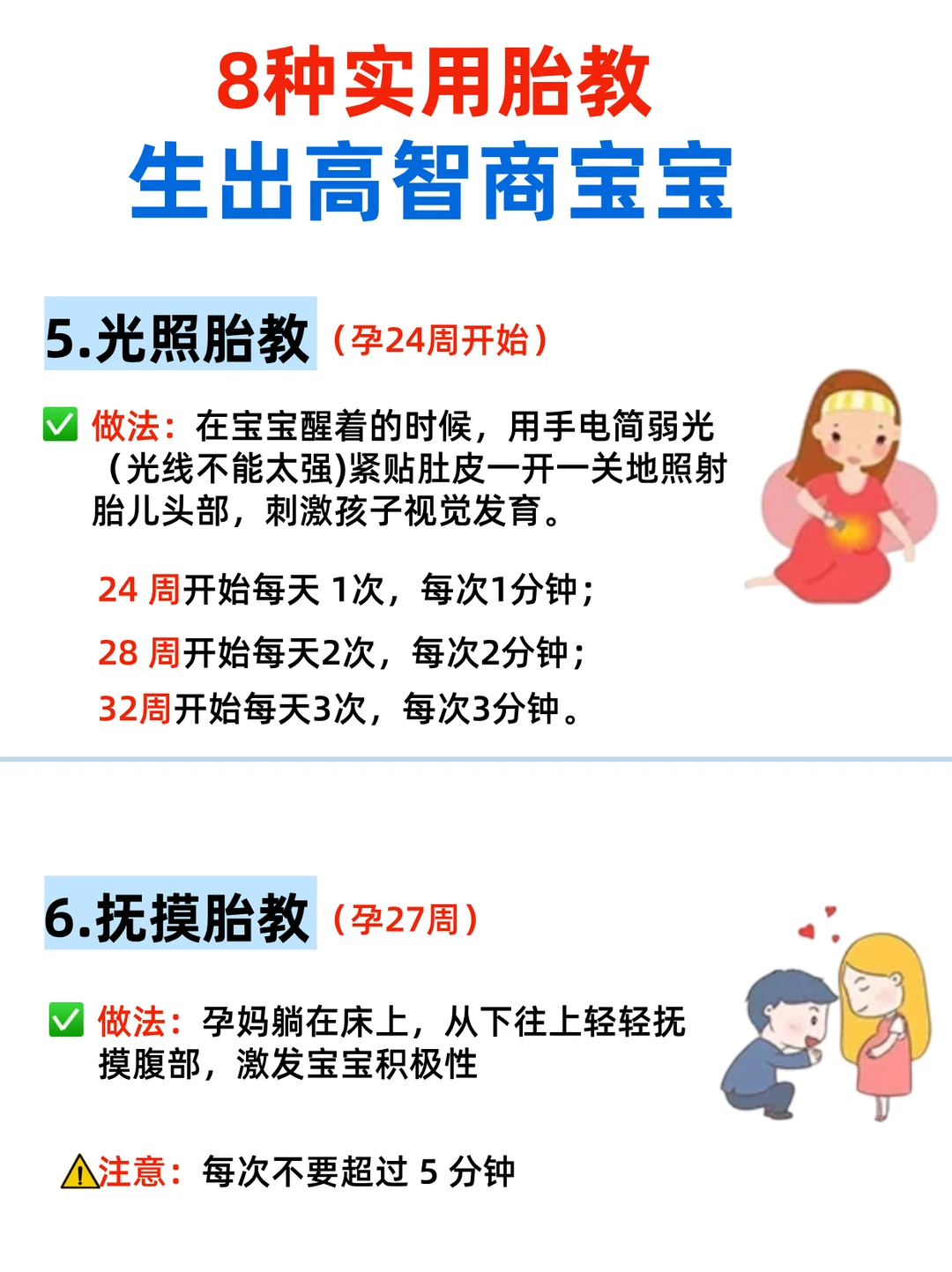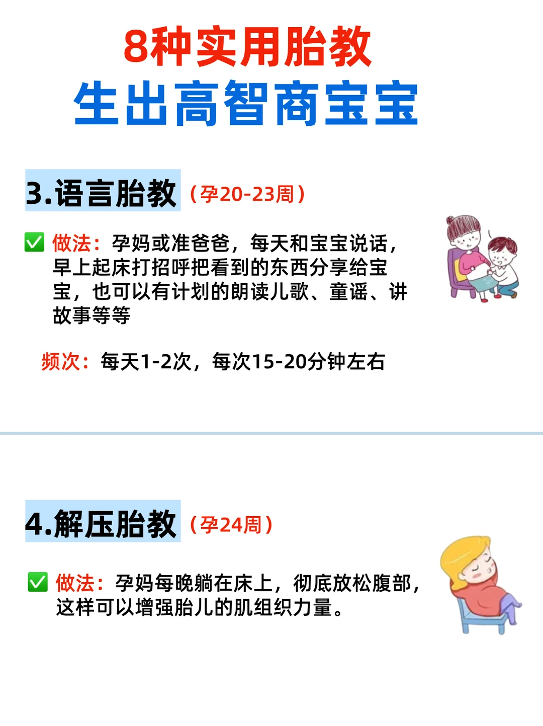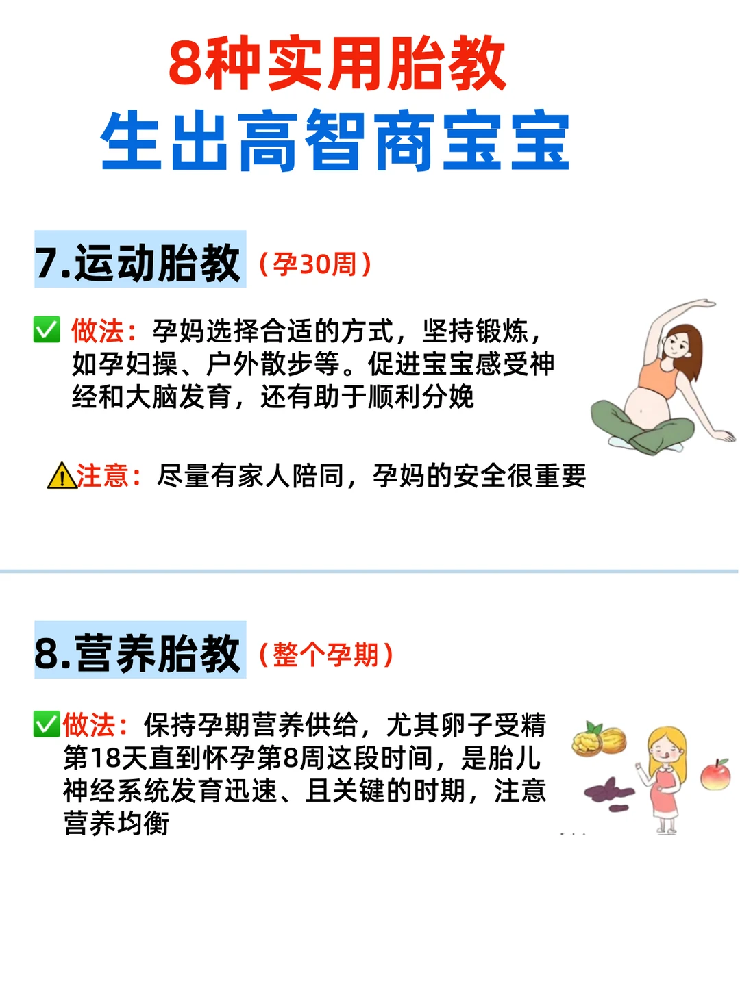 ▪️《小雨滴滴哒》(自然音效超安抚!) 2⃣️情绪胎教💆‍♀️(关键!) 宝宝能感知妈妈情绪! 保持心情愉悦,避免焦虑/生气(会影响宝宝性格!) 我每天听轻音乐+做冥想,宝宝出生后特别乖~ 3⃣️语言胎教🗣️(孕20周后) 多和宝宝说话! 爸爸低沉的嗓音宝宝更爱听👨‍👦 读童话、唱儿歌,宝宝出生后会对你的声音更熟悉! 4⃣️解压胎教🧘‍♀️ 孕期压力大?试试: 深呼吸练习(5秒吸气-5秒呼气) 瑜伽/散步(促进血液循环,宝宝更活跃!) 5⃣️光照胎教🔦(孕24周后) 用手电筒贴肚皮缓慢移动(避开强光!),宝宝会跟着光转动~超神奇! 6⃣️抚摸胎教👐(孕16周后) 轻轻抚摸肚皮,宝宝会踢踢回应你!爸爸参与更佳~ 7⃣️运动胎教🏃‍♀️ 每天散步30分钟(帮助宝宝大脑发育!) 孕妇瑜伽(增强妈妈体质,顺产更轻松💪) 8⃣️营养胎教🍎(超重要!) “吃对食物”=宝宝聪明基础! 多吃DHA(深海鱼、核桃)、叶酸(菠菜)、蛋白质(鸡蛋、牛奶) 我每天一杯孕妇奶粉+坚果,宝宝出生眼睛亮晶晶✨ · ⚠️胎教小心得: 坚持每天互动,宝宝真的会有反应! 爸爸参与很重要,宝宝出生后更亲近爸爸~ 别焦虑!快乐妈妈=聪明宝宝😊 🙋‍♀️你们孕期试过哪种胎教?宝宝有“回应”过吗? 👇接健康聪明宝宝啦~❤️