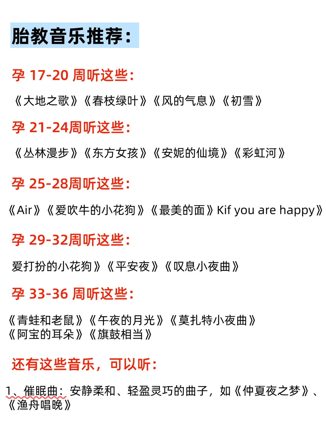 ✅ 方法: 每天1-2次,每次15-20分钟 选择轻柔、舒缓的音乐(莫扎特、古典乐、自然白噪音) 音量不超过65分贝(正常说话声大小) 播放器离肚皮1-1.5米,不要直接贴肚子! 🎧 推荐歌单(亲测宝宝超爱!):