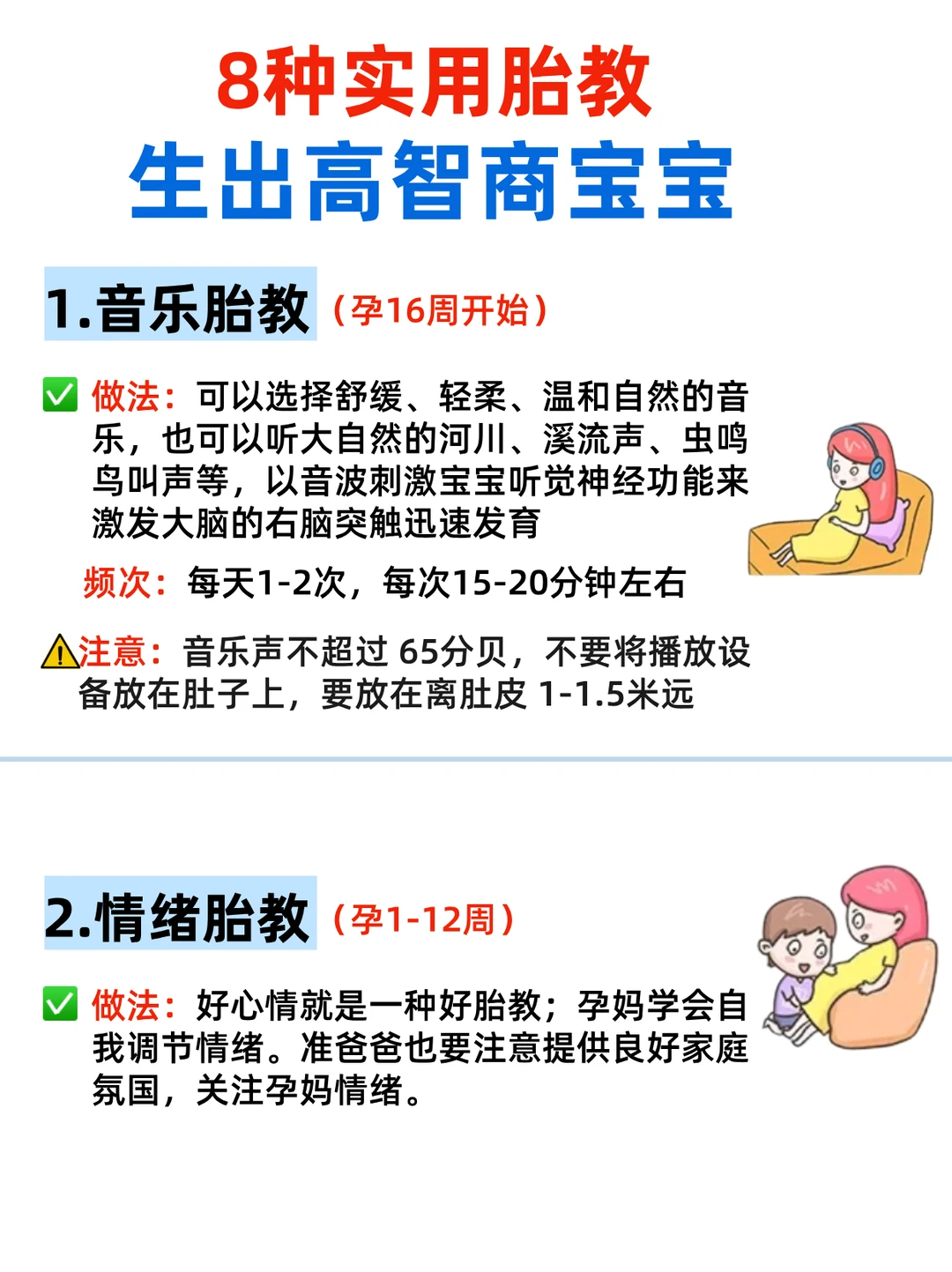 🤰孕期胎教开始做了吗⁉️ 👉今天给大家分享8种高效胎教法,让宝宝在子宫里就开始享受多样化的学习和成长! · 1⃣️音乐胎教🎶(孕16周开始) 作用:刺激宝宝听觉神经,促进右脑发育!