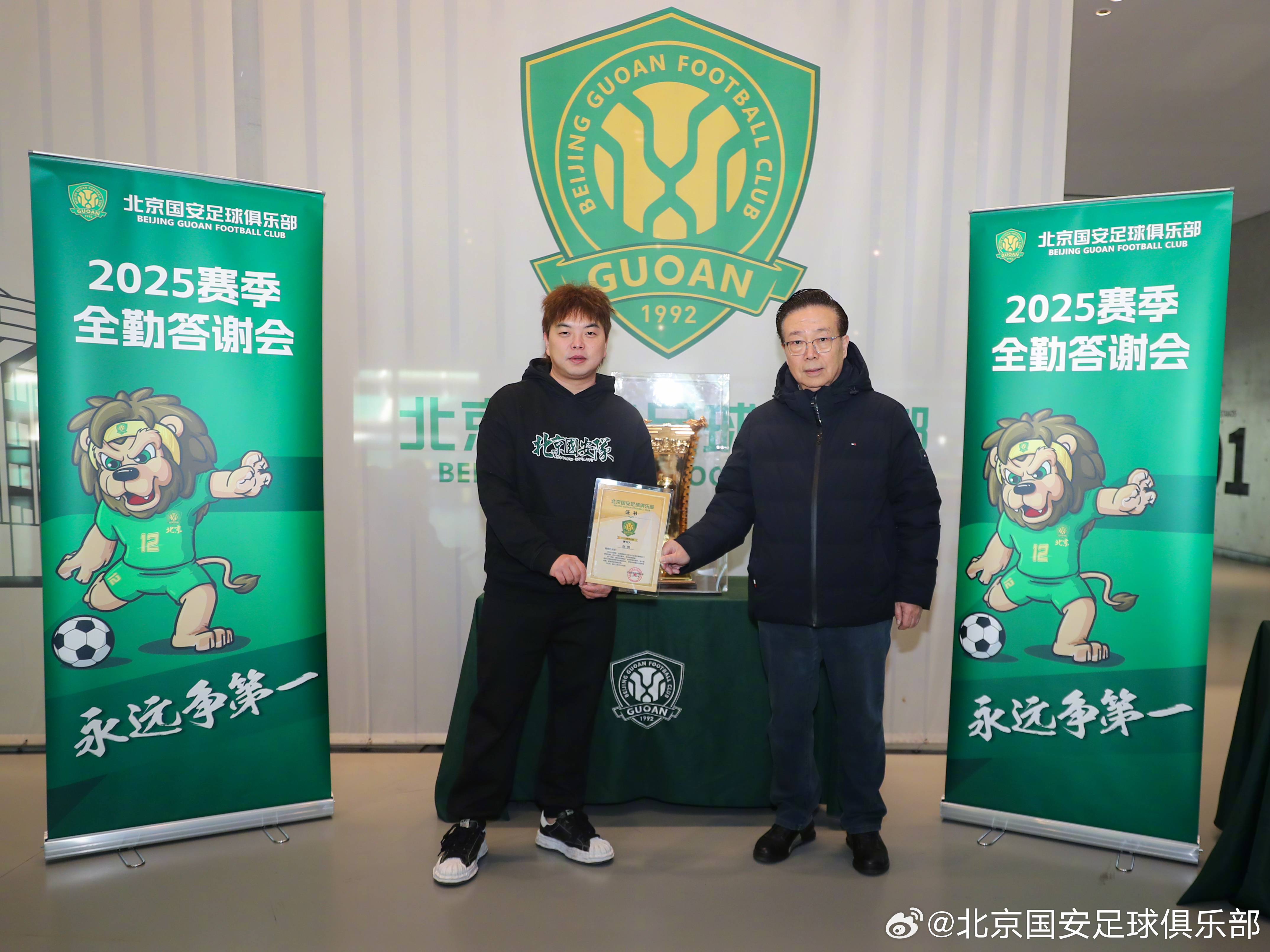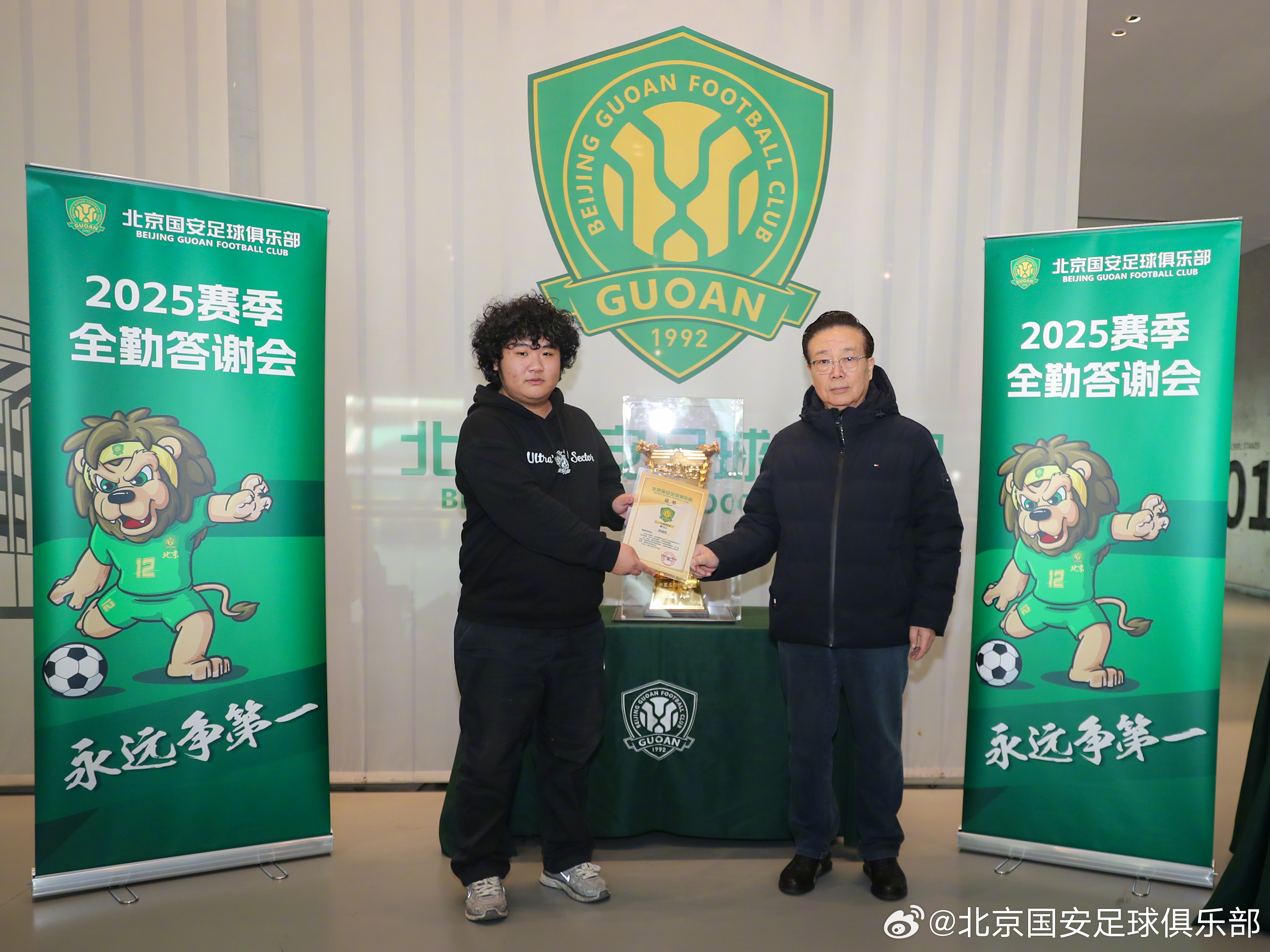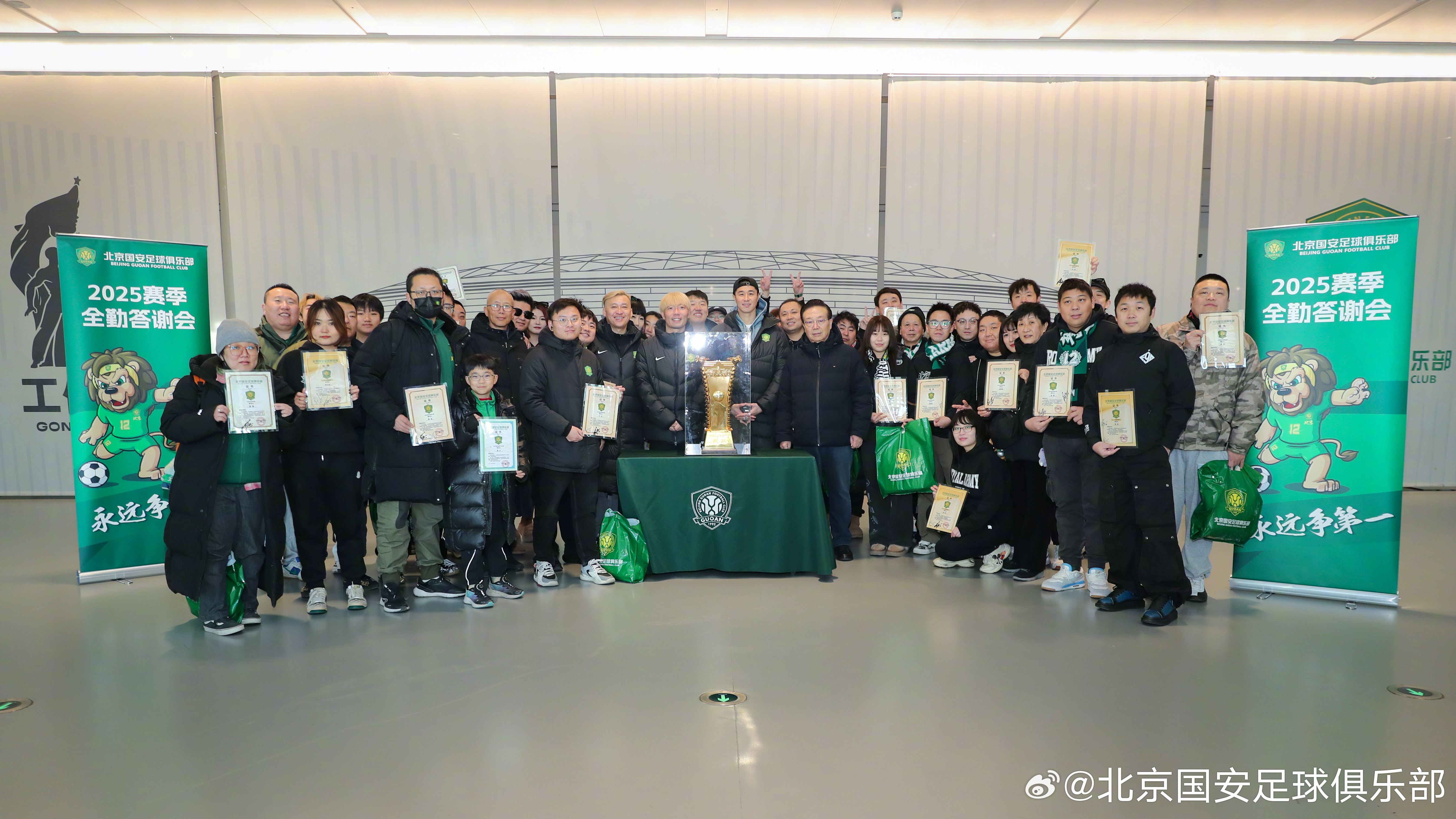 1月11日,北京国安足球俱乐部商务顾问高潮、球员张稀哲和侯森在北京工人体育场为43位2025赛季主客场全勤球迷颁发证书,并代表俱乐部赠送礼品。🎁🎁🎁2025赛季,共有11位球迷完成所有赛事主客场全勤,29位球迷完成国内赛事主客场全勤,3位球迷完成中超联赛主客场全勤。💚💚💚经过补录,截止目前共有3735名球迷完成19场比赛主场全勤,另有3026名球迷完成16场比赛国内赛事主场全勤。俱乐部再次感谢所有球迷一如既往的支持!主场全勤证书领取活动仍在进行,请尚未领取证书的球迷及时领取。【领取方式】全勤球迷证书领取时间:1月12日(周一)--1月14日(周三),每天10:00-16:00。地点:朝阳区世茂工三商场1层,孚德足球IP专卖店。【领取凭证】请各位全勤球迷持本人2025赛季年卡或身份证作为身份凭证,前往活动现场领取证书。如需代领证书,请代领人持被代领人身份证或身份证照片到现场领取。【福利】每位全勤球迷均可以领取足协杯夺冠纪念冰箱贴1枚凭借全勤证书,球迷也可在世贸工三孚德足球IP周边店享受购物折扣。全场产品85折,部分产品5、6、7折。(冠军系列产品不参与活动)活动时间:同全勤奖领奖时间。【注意事项】为提升领取证书体验,请您在提供身份凭证的同时,告知工作人员证书编号(编号按姓氏拼音首字母顺序排列,可在公示名单中查询 )