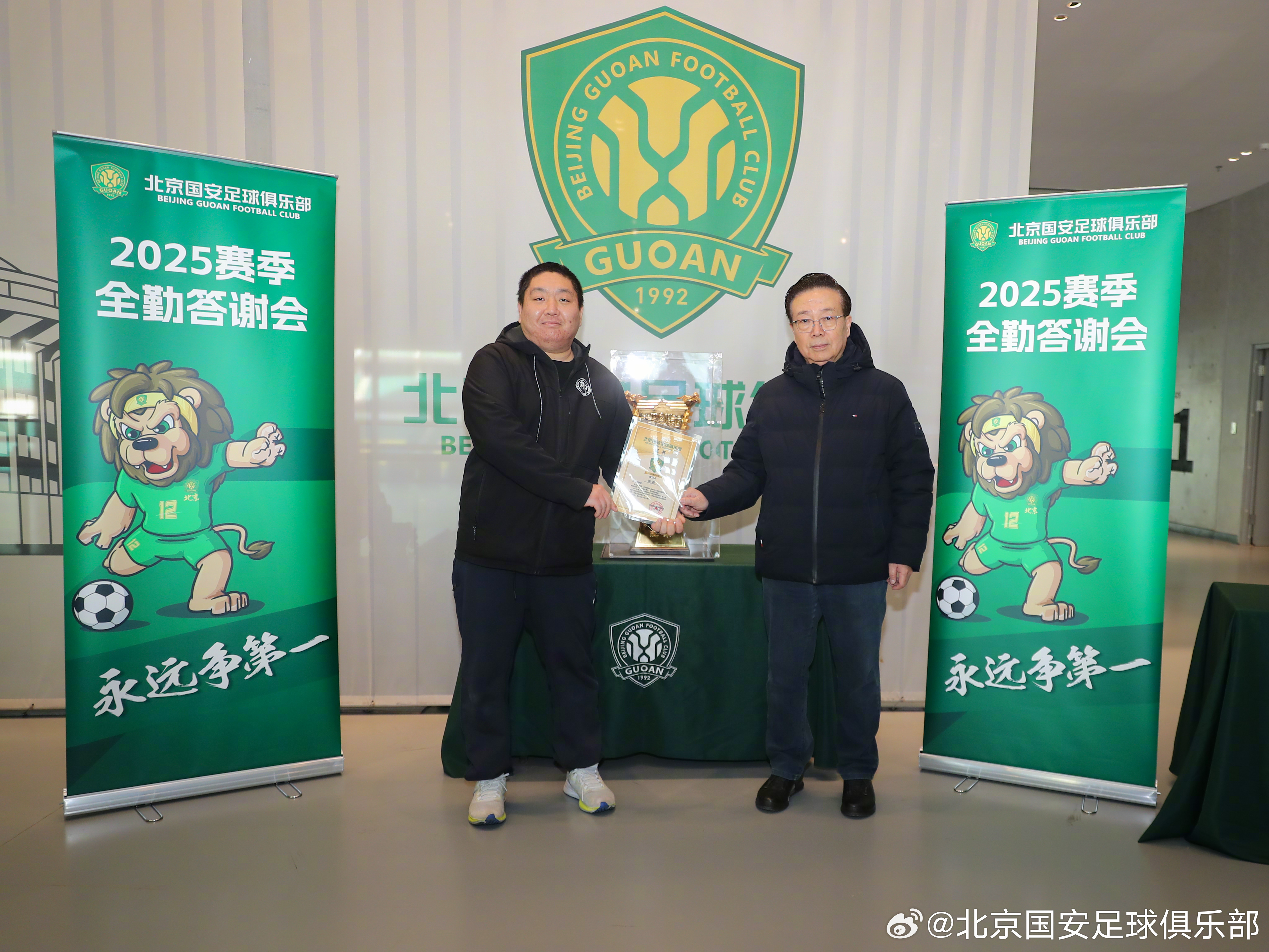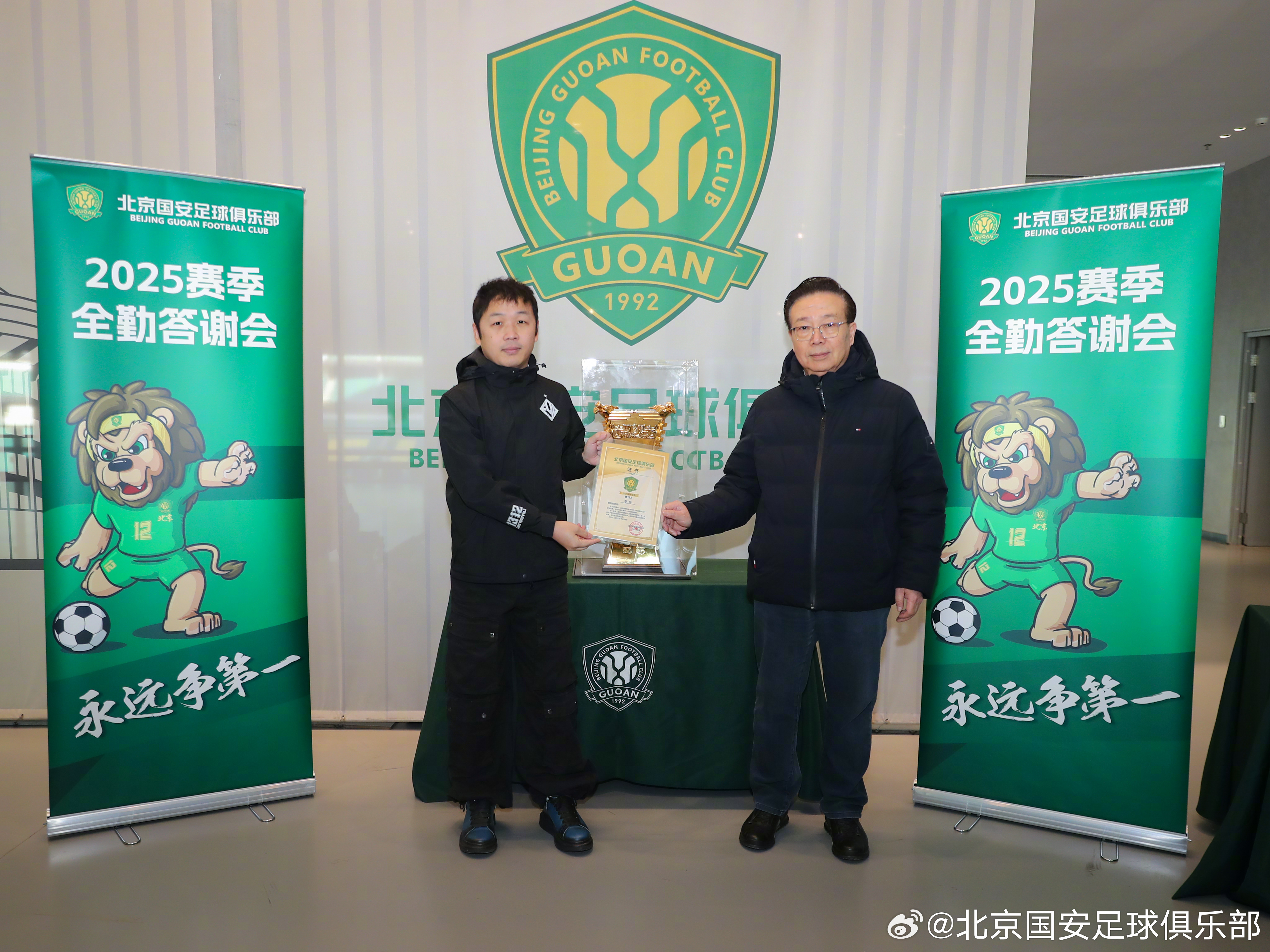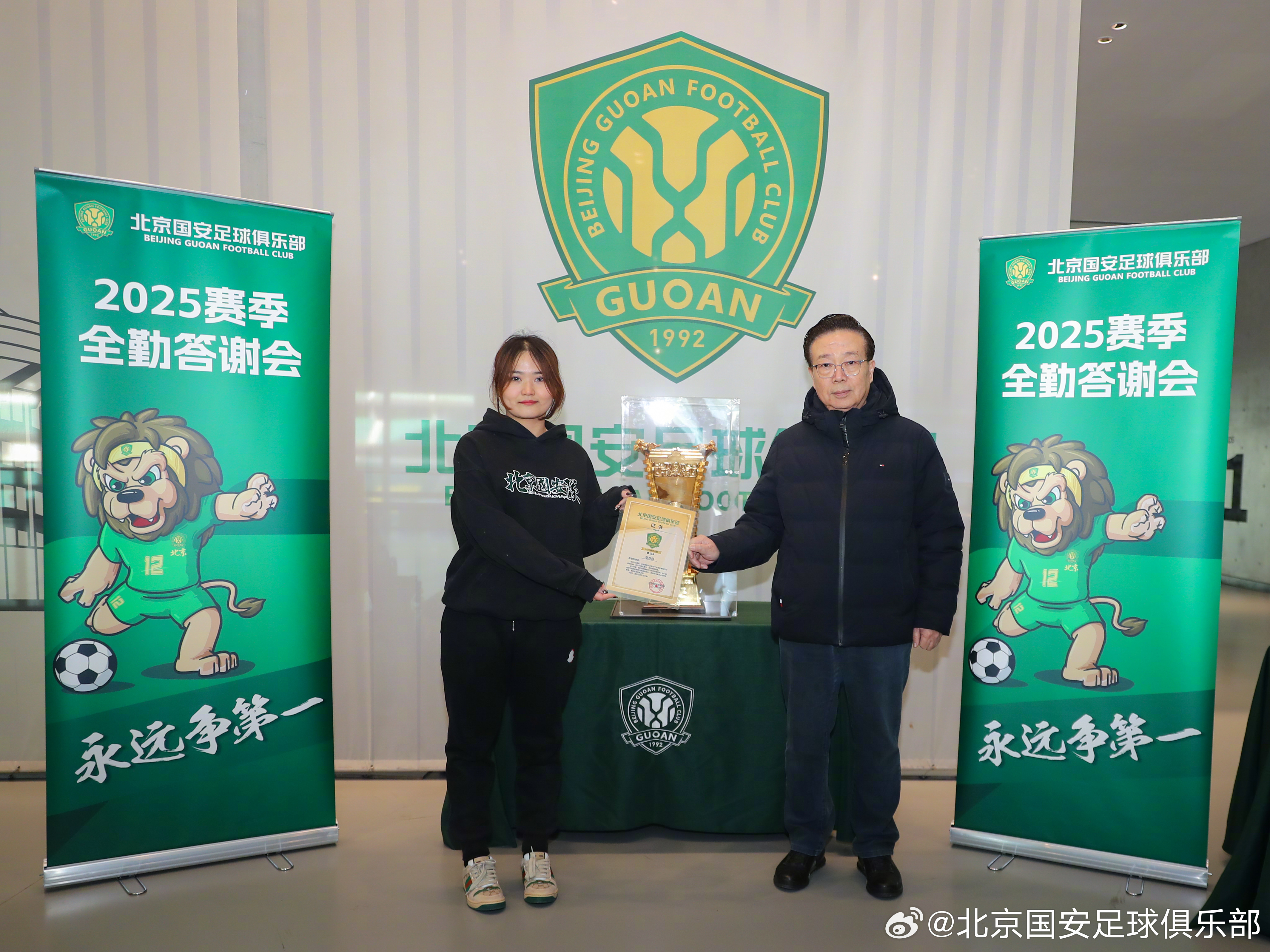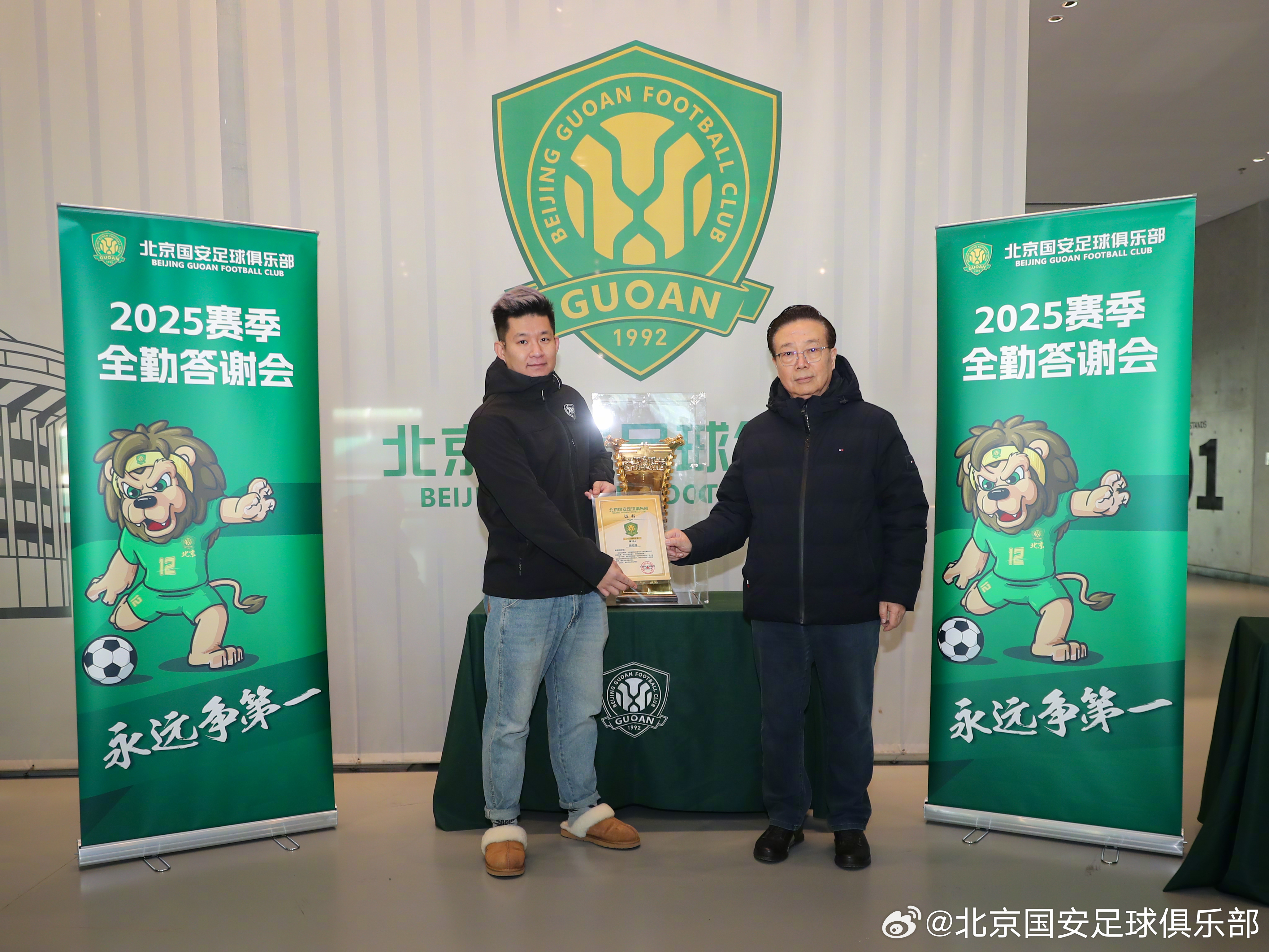 1月11日,北京国安足球俱乐部商务顾问高潮、球员张稀哲和侯森在北京工人体育场为43位2025赛季主客场全勤球迷颁发证书,并代表俱乐部赠送礼品。🎁🎁🎁2025赛季,共有11位球迷完成所有赛事主客场全勤,29位球迷完成国内赛事主客场全勤,3位球迷完成中超联赛主客场全勤。💚💚💚经过补录,截止目前共有3735名球迷完成19场比赛主场全勤,另有3026名球迷完成16场比赛国内赛事主场全勤。俱乐部再次感谢所有球迷一如既往的支持!主场全勤证书领取活动仍在进行,请尚未领取证书的球迷及时领取。【领取方式】全勤球迷证书领取时间:1月12日(周一)--1月14日(周三),每天10:00-16:00。地点:朝阳区世茂工三商场1层,孚德足球IP专卖店。【领取凭证】请各位全勤球迷持本人2025赛季年卡或身份证作为身份凭证,前往活动现场领取证书。如需代领证书,请代领人持被代领人身份证或身份证照片到现场领取。【福利】每位全勤球迷均可以领取足协杯夺冠纪念冰箱贴1枚凭借全勤证书,球迷也可在世贸工三孚德足球IP周边店享受购物折扣。全场产品85折,部分产品5、6、7折。(冠军系列产品不参与活动)活动时间:同全勤奖领奖时间。【注意事项】为提升领取证书体验,请您在提供身份凭证的同时,告知工作人员证书编号(编号按姓氏拼音首字母顺序排列,可在公示名单中查询 )