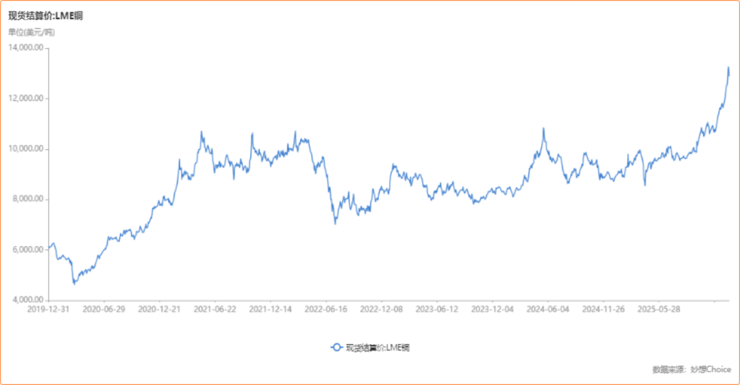 以LME铜为基准,2025年内铜价多数时间处于高位震荡的走势。但自9月美联储宣布重启降息起,铜价再度上行,年末突破12,000美元/吨,全年涨幅超40%,创下2009年以来最强劲年度表现。