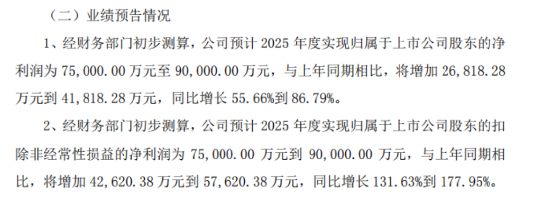 2025年全年,预计归母净利润为7.50亿至9.00亿,同比增长55.7%至86.8%;扣非净利润的预测区间与归母净利润相当,但同比增幅高达131.6%至178.0%。