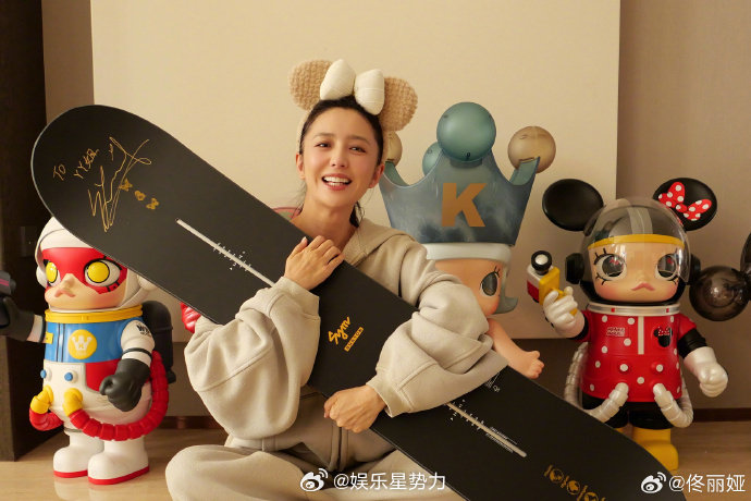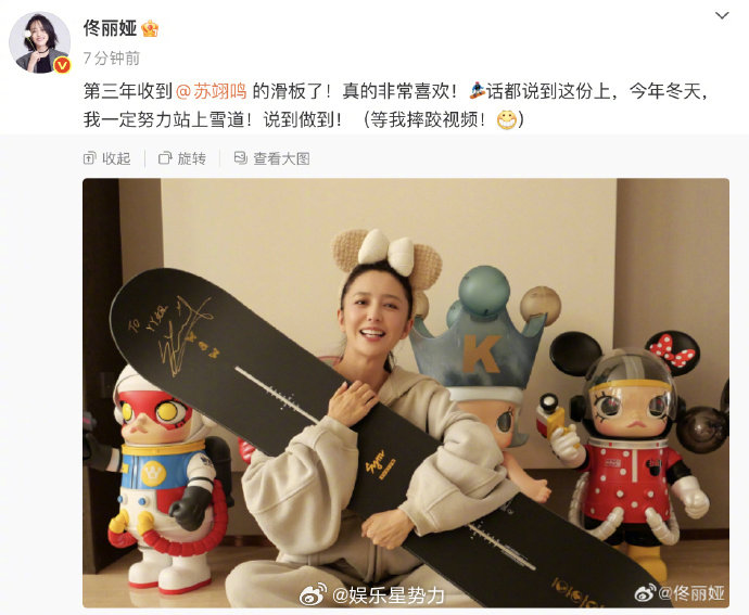 1月14日,佟丽娅在社交平台分享自己两张照片,并配文:“第三年收到苏翊鸣的滑板了
