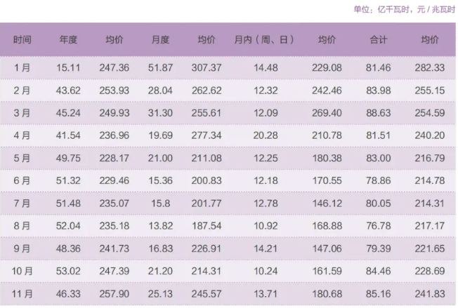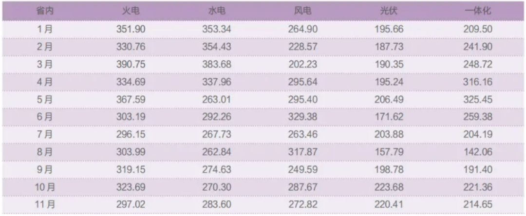11月,火电结算均价297.02元/MWh,水电283.60元/MWh,风电272.82元/MWh,光伏220.41元/MWh,一体化214.65元/MWh。
