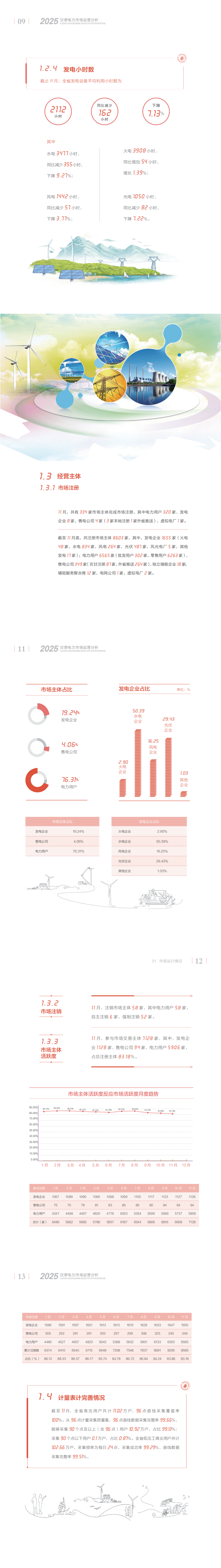 截至11月底,共注册市场主体8603家,其中,发电企业1655家(火电48家,水电834家,风电264家,光伏487家,风光电厂5家,其他发电17家);电力用户6565家(批发用户302家,零售用户6263家),售电公司349家(在甘注册87家,外省推送264家),独立储能企业18家;辅助服务聚合商12家,电网公司1家,虚拟电厂2家。