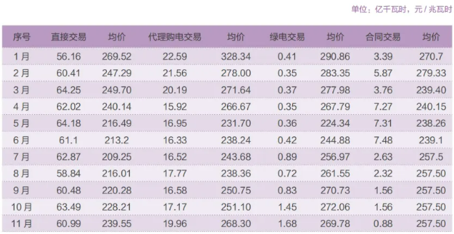 11月,省内中长期市场按自然日连续运营,交易总成交电量85.16亿千瓦时。其中,年度(多年)交易46.33亿千瓦时,成交均价257.9元/兆瓦时;月度交易成交电量25.13亿千瓦时,成交均价245.57元/兆瓦时;月内(周、日)交易成交13.71亿千瓦时,均价180.68元/兆瓦时。