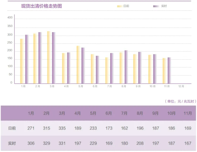 11月,省内现货市场发电侧正偏差电量58.43亿千瓦时,负偏差电量-55.48亿干瓦时,正负相抵后,净偏差电量2.95亿千瓦时。日前、实时市场最高/最低出清电价均达到650元/兆瓦时和40元/兆瓦时限价,日前市场平均价格169元/兆瓦时,同比下降46.1%,环比下降9.0%,日前市场均价最高267元/兆瓦时,最低53元/兆瓦时;实时市场平均价格167元/兆瓦时,同比下降49.6%,环比下降10.7%,实时市场均价最高266元/兆瓦时,最低75元/兆瓦时。