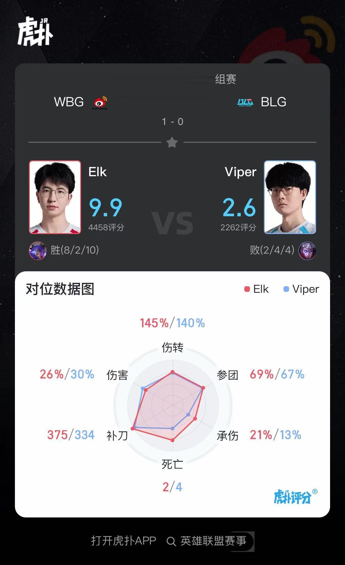 虎扑01月15日讯在刚刚结束的WBG对阵BLG的BO3比赛中,Elk芸阿娜打出8/2/10战绩,斩获WBG对阵BLG第一局MVP