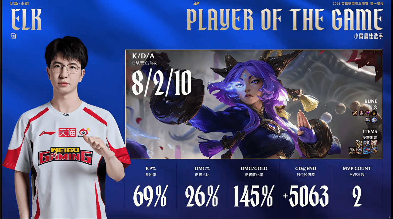 Elk芸阿娜打出8/2/10战绩,斩获WBG对阵BLG第一局MVP