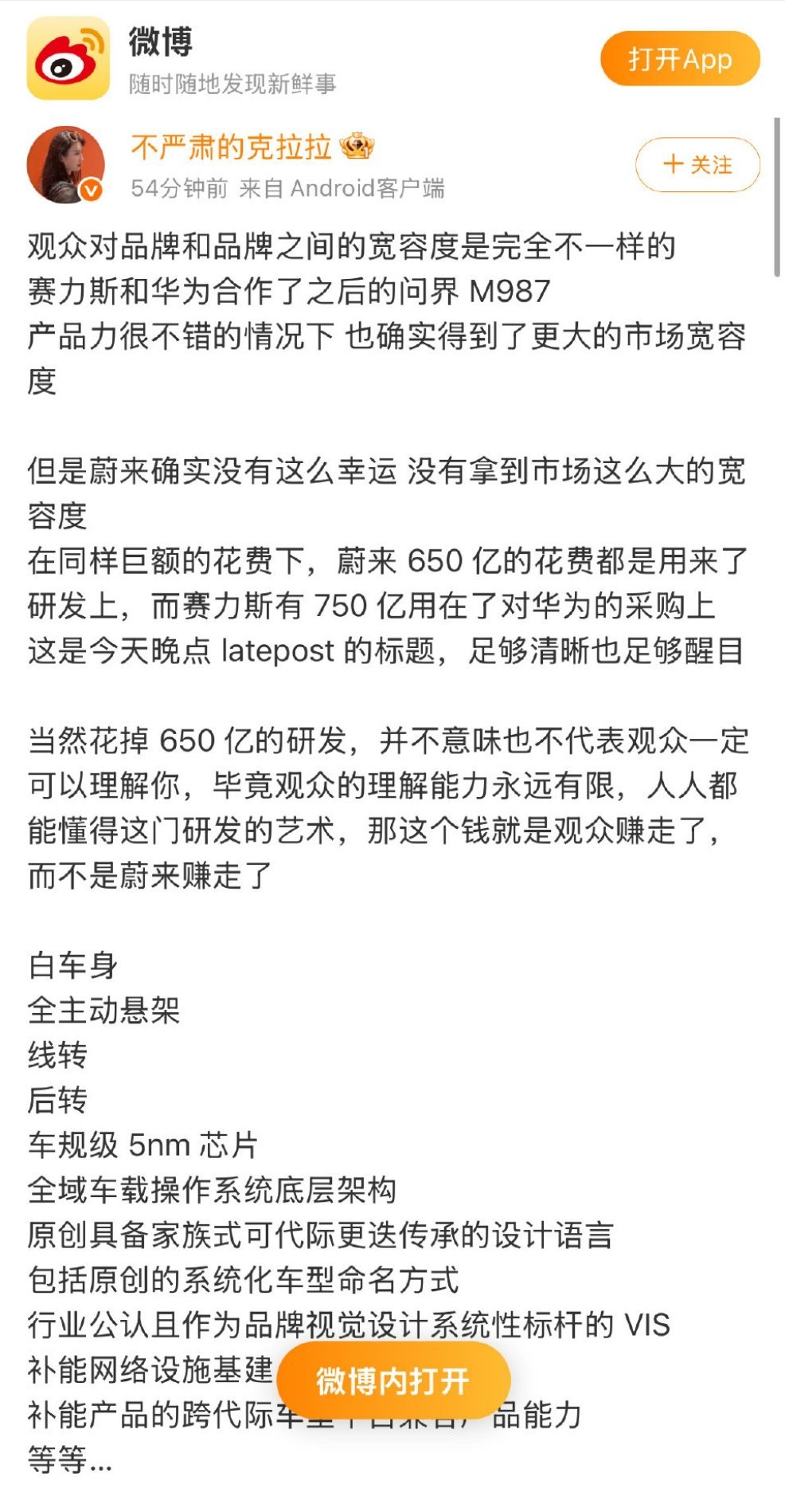 典型的无良媒体报道出了偏差,无良自媒体拿去当真理趁机拉踩捧一波自家giegie的经典案例∶ 首先支付给菊厂,是否有说明是对应的是哪个时间段的款项吗?都没明确是否款项是否仅包含上半年的产能,直接盲除上半年销量,得出一个14万,这是哪里学的 其次,车本身核心零部件也是采购自菊厂的,付钱难道不是天经地义么,而且人家研发的智驾,因为是赛力斯采购的,就不算研发了吗? 你是和赛力斯比研发费用,还是和问界比,还是和菊厂比? 连对手是谁都没搞清楚就抓着“赛力斯是采购的没有研发哈哈不如我家giegie研发费用多”,是不是有些抽象? 而且,人家采购东西在你看来是不值得的,是没有含金量的智驾,结果吊打你自研的,请问为何如此自讨没趣? 那在你眼里没有研发费用的,卖的比你好,说明谁对投资者不负责呢? 而且不止智驾,很多硬件也是菊厂提供的,搁这用自己“研发费用多”酸别人的效率,不会降低别人的效率,只会告诉大家“我家giegie投入产出太差了”——一直以为KOC只能无脑吹,批评就不忠了,原来批评,也忠的! 最后,在这提宽容度,怎么不看看雷总受到了多大的压力?雷总卖一台车还亏钱,大家宽容他了吗?无良媒体暗示造车成本其实很低,那不就又是在告诉大家雷总被下面人坑了么,媒体也忠? 抽象汽车商业评论赢学研究