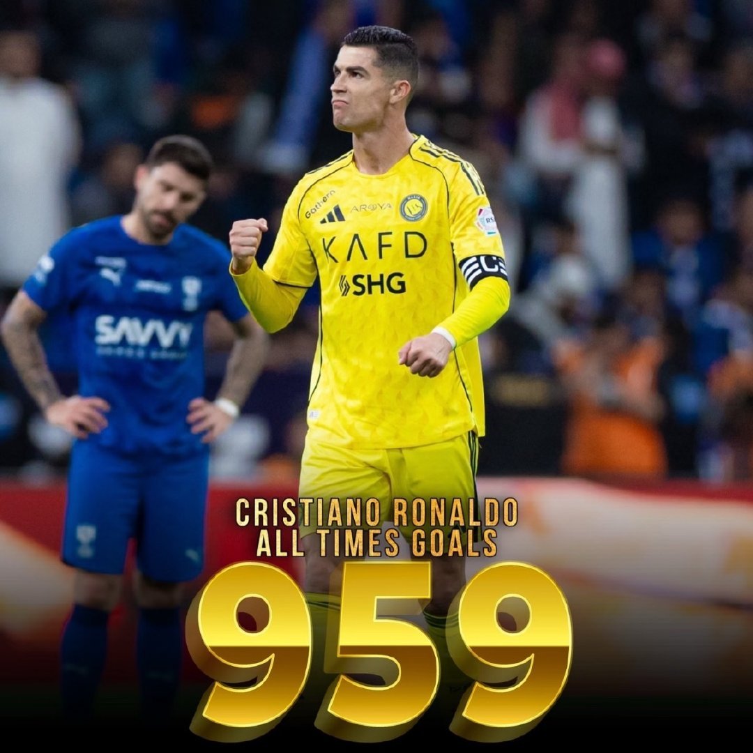 C罗959球C罗959球 传奇不老!40岁C罗在利雅得德比中凌空推射破门,将职业生涯总进球数刷新至959粒,继续霸占足坛历史射手王宝座🔥连续26个自然年进球、30岁后狂轰496球、领跑沙特联赛射手榜,他用7%体脂率和9.7公里单场跑动诠释自律,距离千球伟业仅差41球。虽球队1-3遭逆转吞三连败,但孤胆英雄的怒吼“Siu”,依旧是足坛最动人的坚守✨