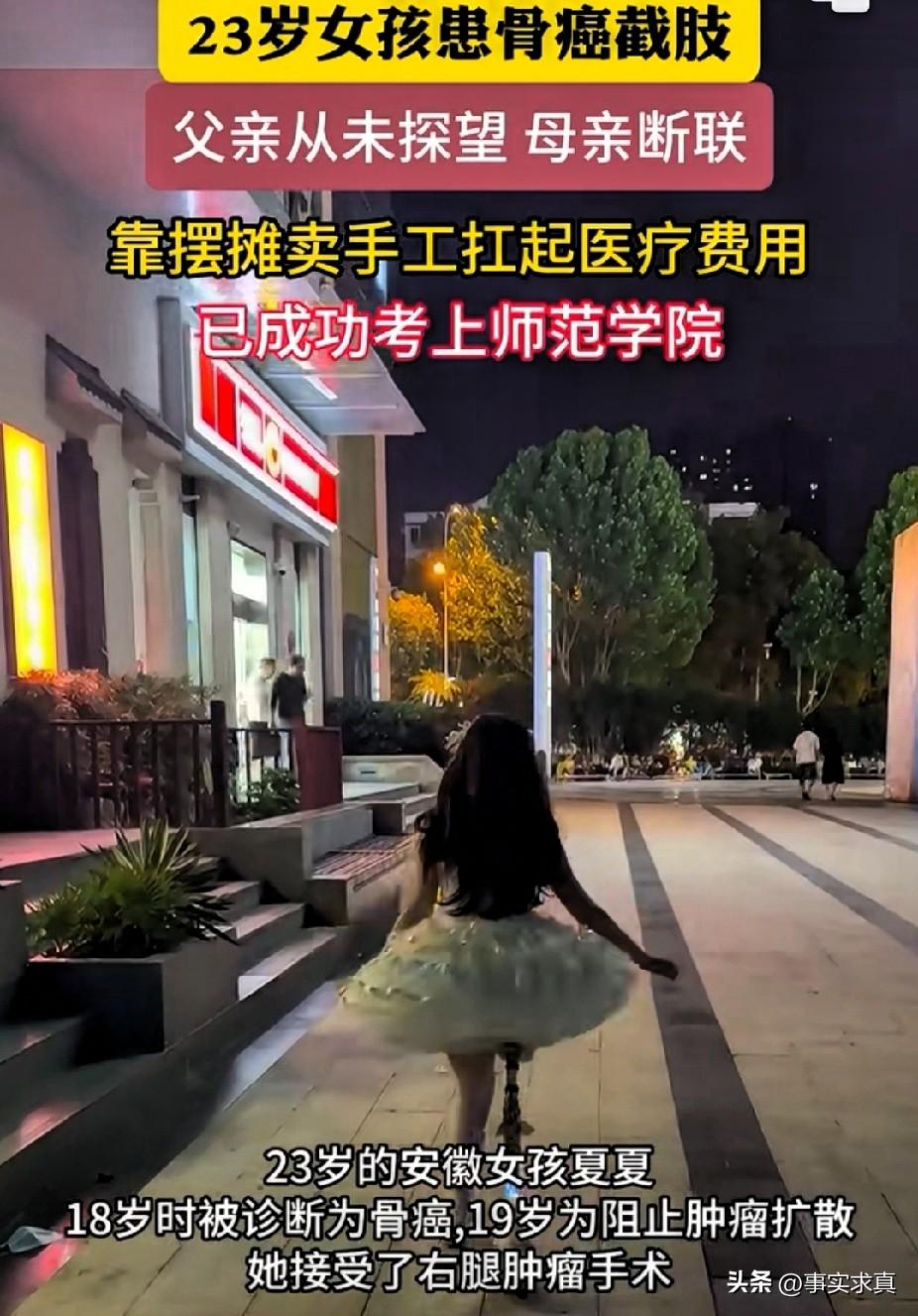 爱笑的女孩运气不会差,安徽骨癌女孩自己撑起一片天 23岁安徽女孩夏夏,一位有钢铁性格女孩,5年前检查出骨癌,需要做了右腿截肢手术,在家属签字的时候竟然是自己签的,父亲连面都没见,母亲竟然在夏夏还没康复时也不告而别至今失联。夏夏的就是这样的状况下,自己独自扛下了这个年龄期不该经受苦难,她常说的一句话就是:“美女肯定健康起来”5年的时间里她靠自己摆地摊做手工维持所有的医疗费用,在夏夏经过自己的努力考上师范学校,一个爱笑的女孩运气一定不会差,祝:夏夏以后会愈来愈好