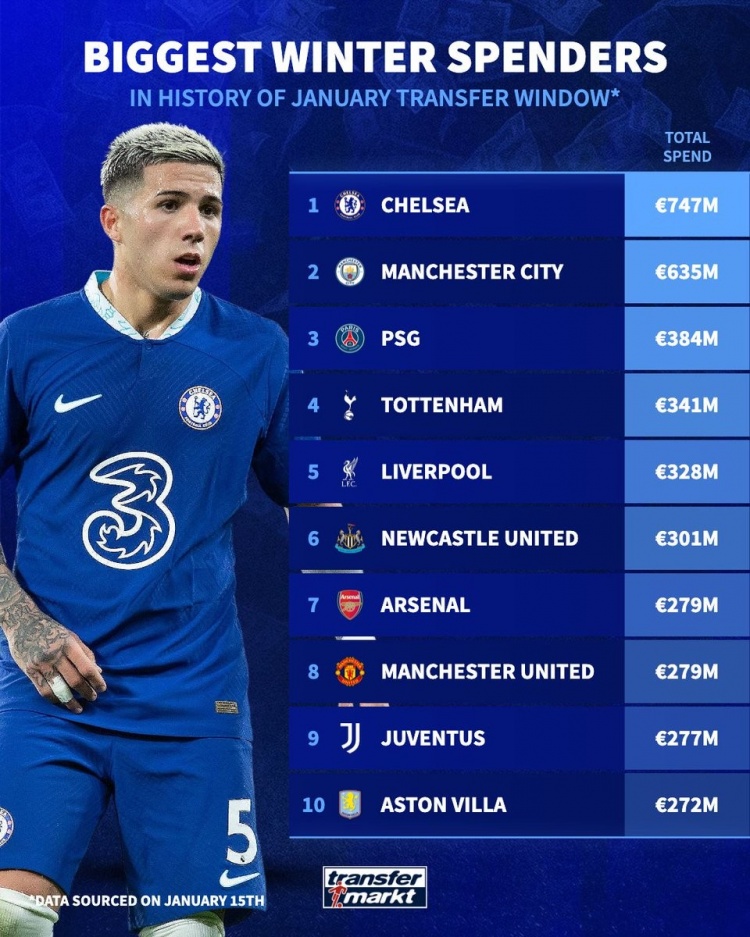 直播吧1月15日讯《转会市场》统计了截止今年1月15日以来的冬窗历史转会总支出情况,切尔西力压曼城居首,前十英超占据8席。