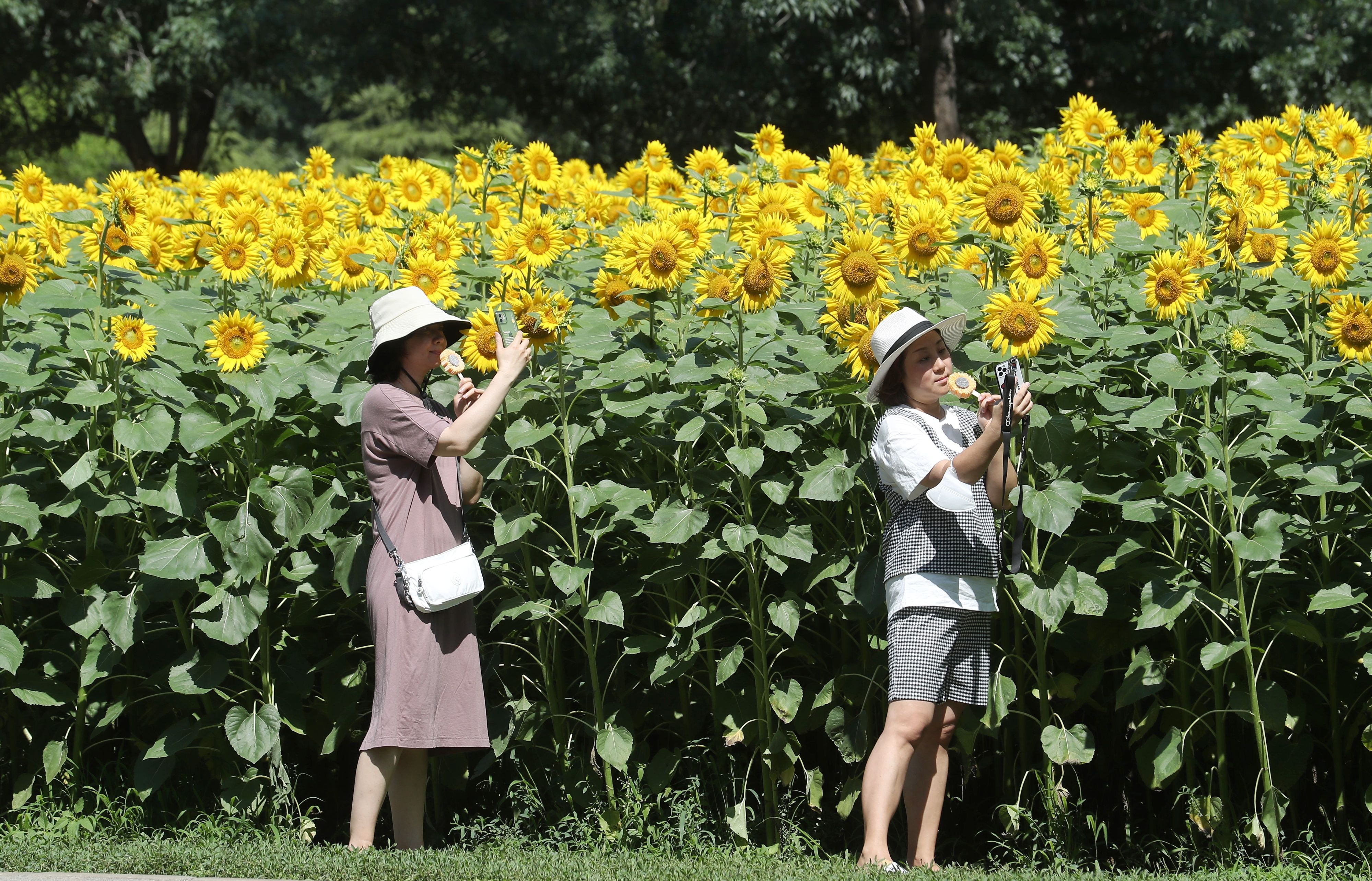 ▲北京奥林匹克森林公园,游客在向日葵花田手持向日葵雪糕,边吃边拍。新京报记者王飞摄