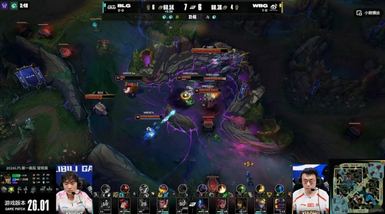 [8:46]Jiejie蔚主动出击,Q闪R锁头配合上Xiaohu蛇女的缚地,两人合力强杀掉了knight岩雀!巢虫也是WBG的2-1!