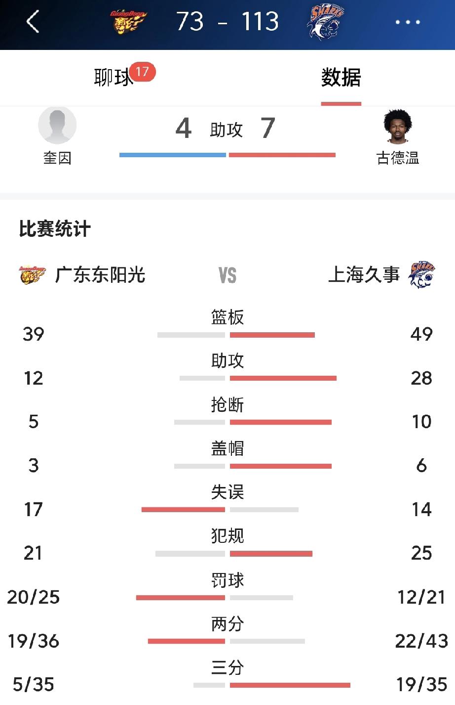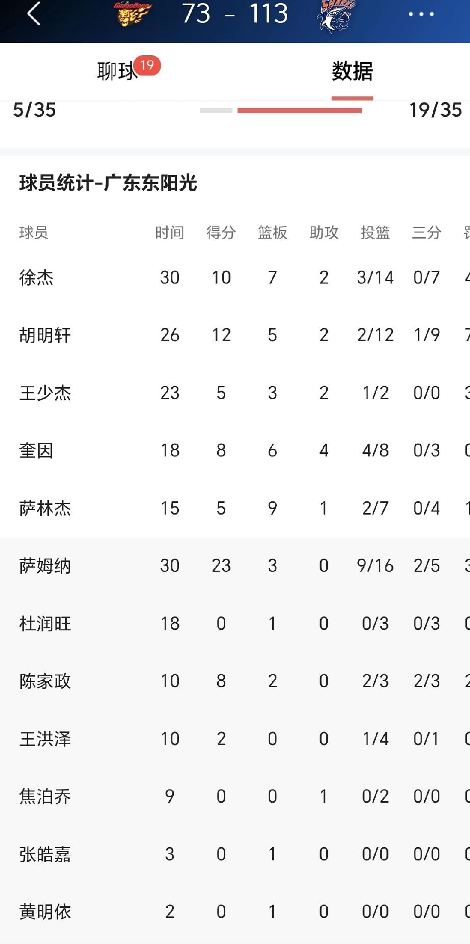 徐杰14中3,胡明轩12中2,广东队73:113不敌上海队,差距真有这么大吗?