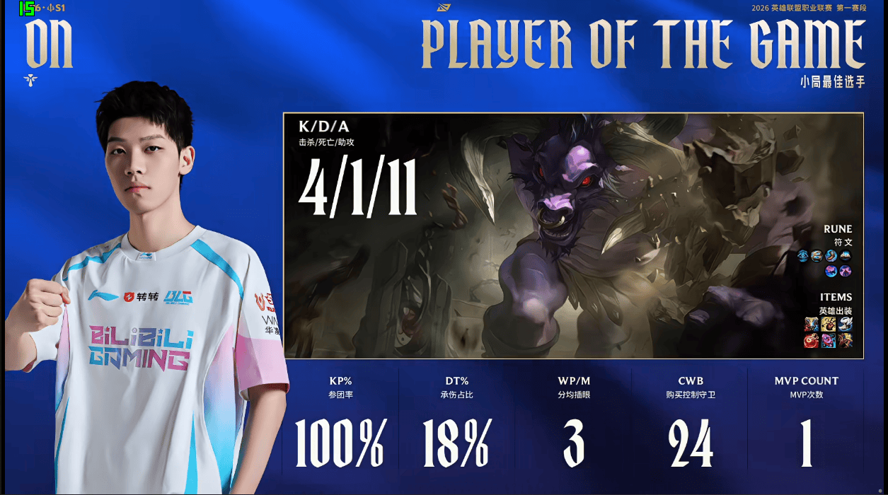 ON牛头打出4/1/11战绩,斩获BLG对阵WBG第三局MVP