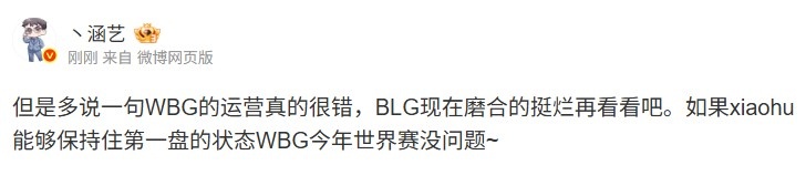 但是多说一句WBG的运营真的很不错,BLG现在磨合的挺烂再看看吧。如果xiaohu能够保持住第一盘的状态WBG今年世界赛没问题~