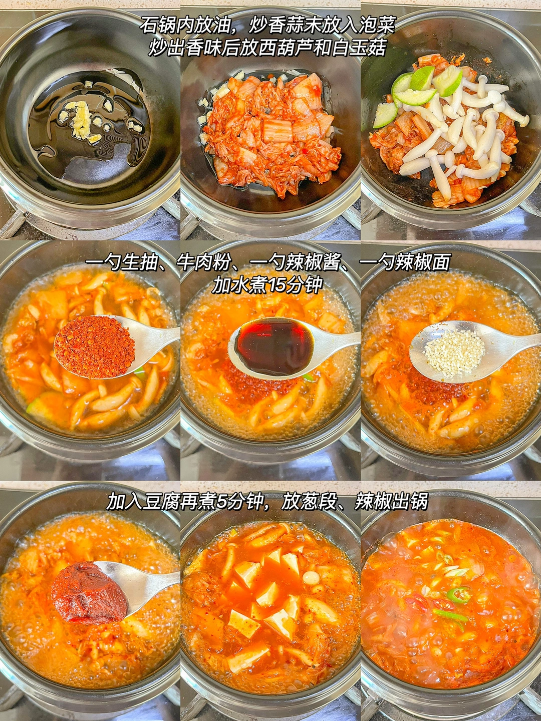 ❶石锅内放油,炒香蒜末放入泡菜,炒出香味后放西葫芦和白玉菇