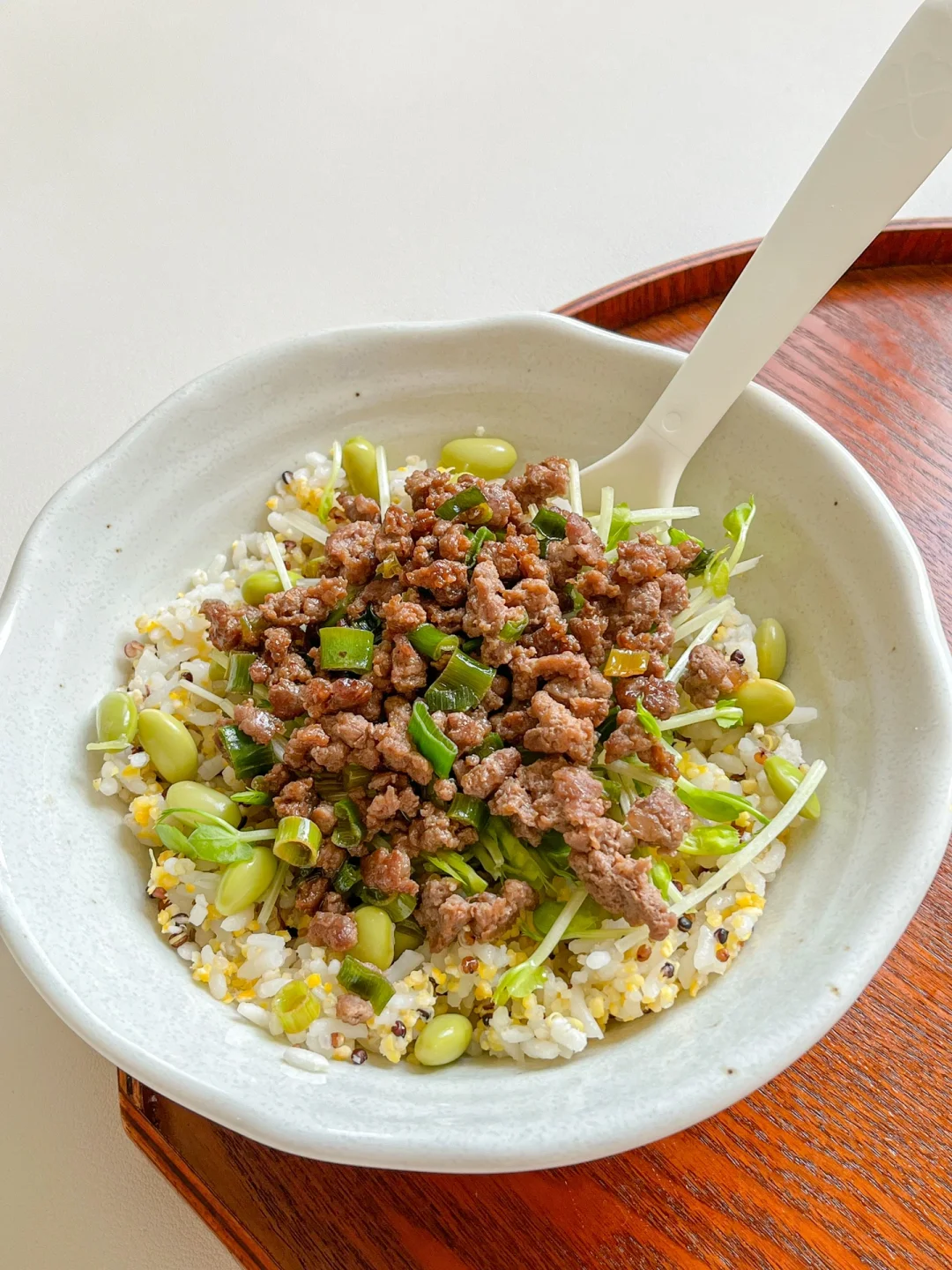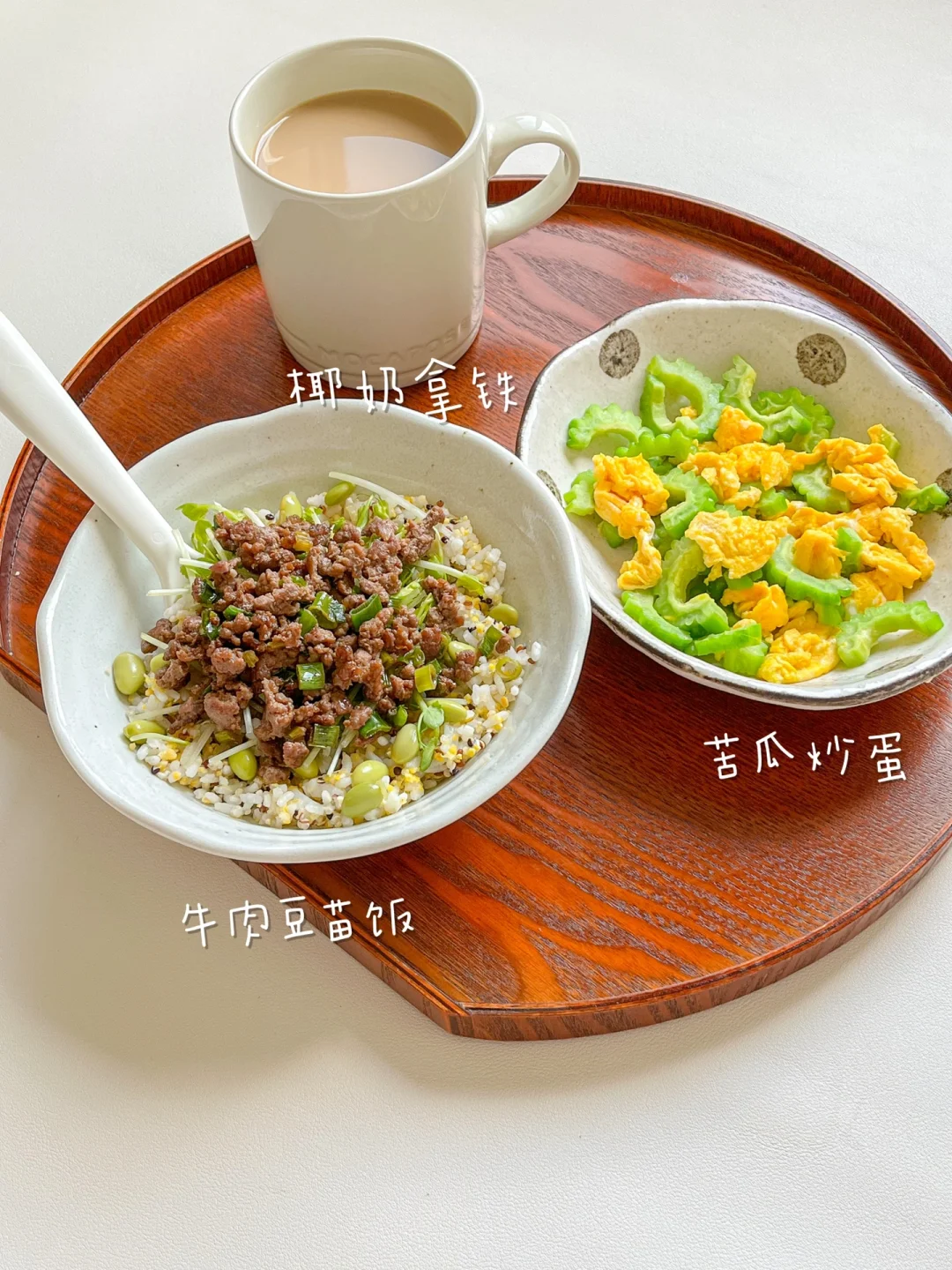 “吃的好、吃的简单、吃的健康、吃的丰富,身体才会吸收足够的营养。好看又可爱的彩色食物能让我们快乐减脂!” 今日午餐: ¹牛肉馅豆苗饭 ²苦瓜炒蛋 ³椰奶拿铁 🟠牛肉馅豆苗饭 牛肉馅和绿豆苗的搭配,又能补充蛋白质还有丰富的蔬菜。夏天到了,可以在米饭里混点煮熟的毛豆,毛豆含糖量少,可以多放[偷笑R] 🟢苦瓜炒蛋 苦瓜是很适合夏天吃的食物,还有很丰富的维C,还能降糖、清热去火。提前用盐水泡一下,跟鸡蛋一起炒就能减少苦味。