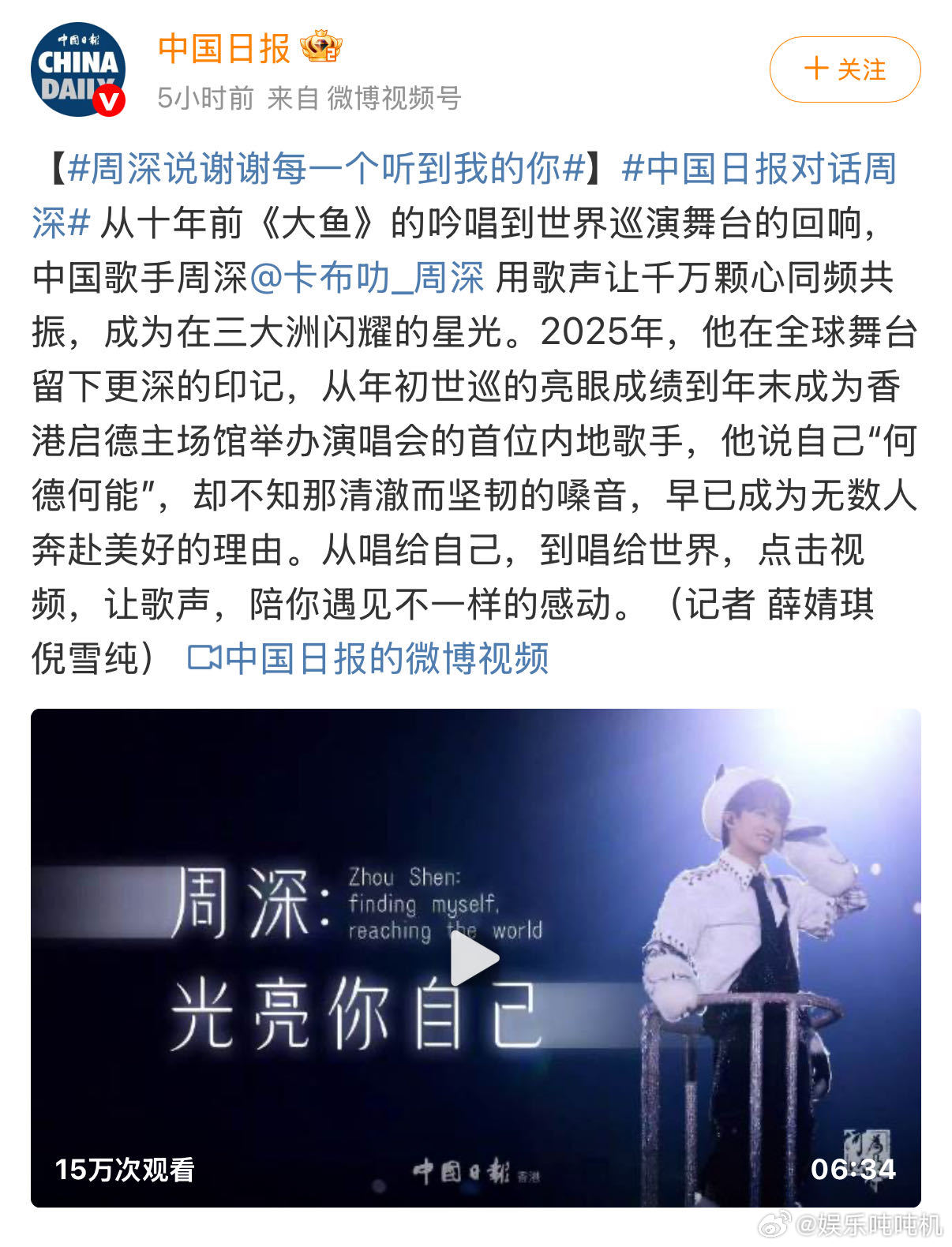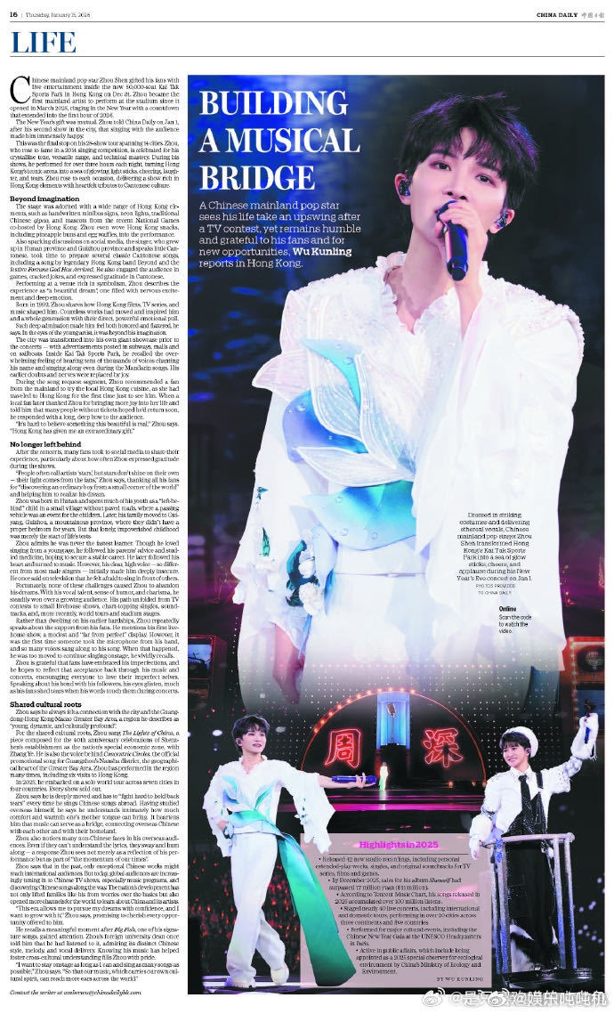 周深音乐影响力获中国日报认可周深搭建音乐桥梁 中俄双语舞台封神,民俗与流行创新融合,《中国日报》肯定其文化软实力贡献!