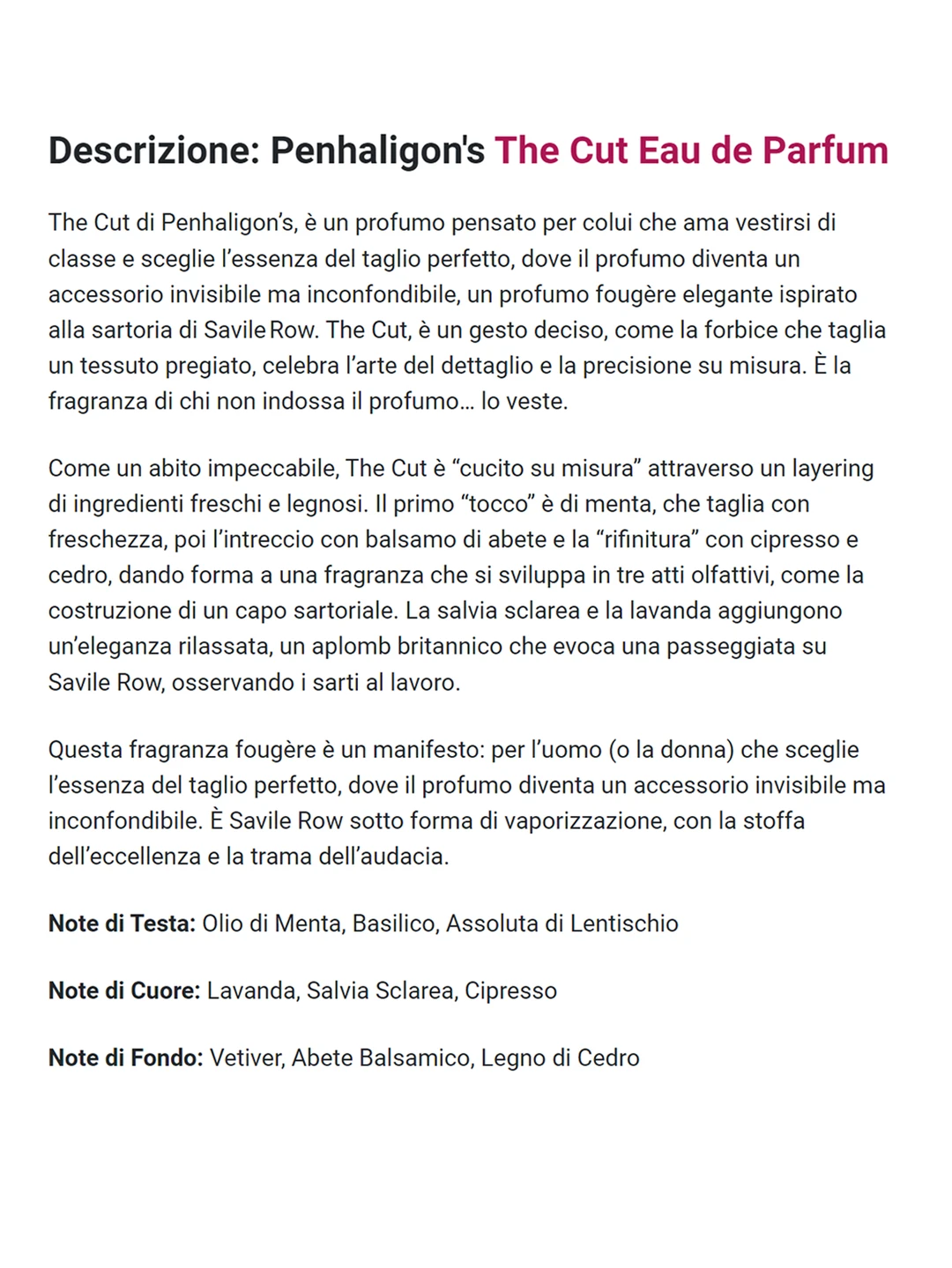 🌲 在“量身定制”的剪裁下,第一个“触感”是薄荷香气,它带来切割后的新鲜空气,然后经过冷杉、柏树和雪松的编织后,形成了一种三位一体的嗅觉体验。鼠尾草和薰衣草为香气增添了一份悠闲的优雅,一种属于英国的平静,让人想起在萨维尔街散步,看着裁缝们工作的场景。