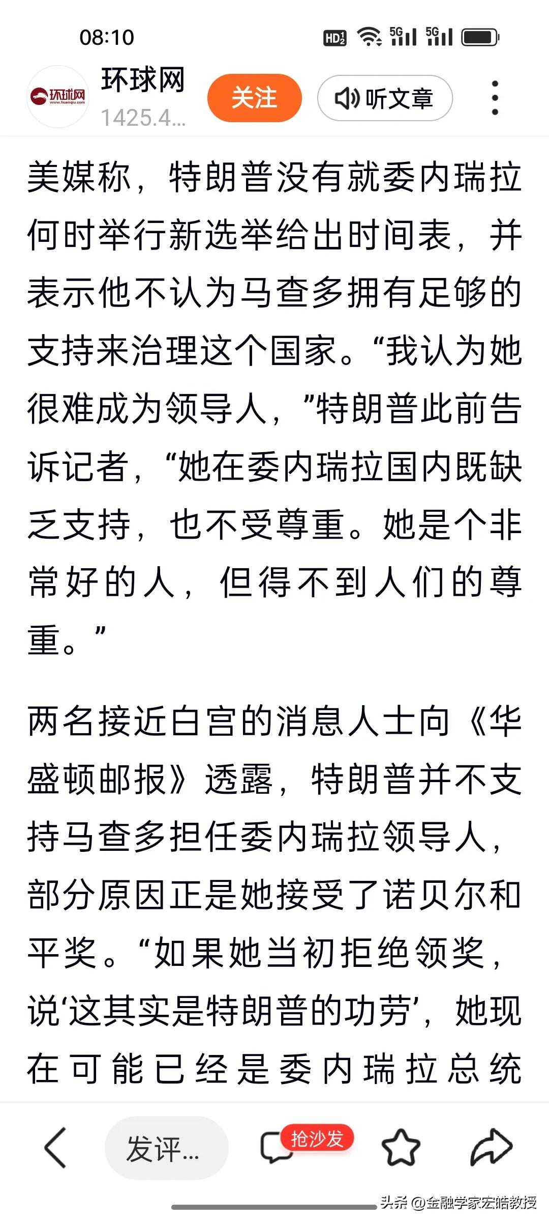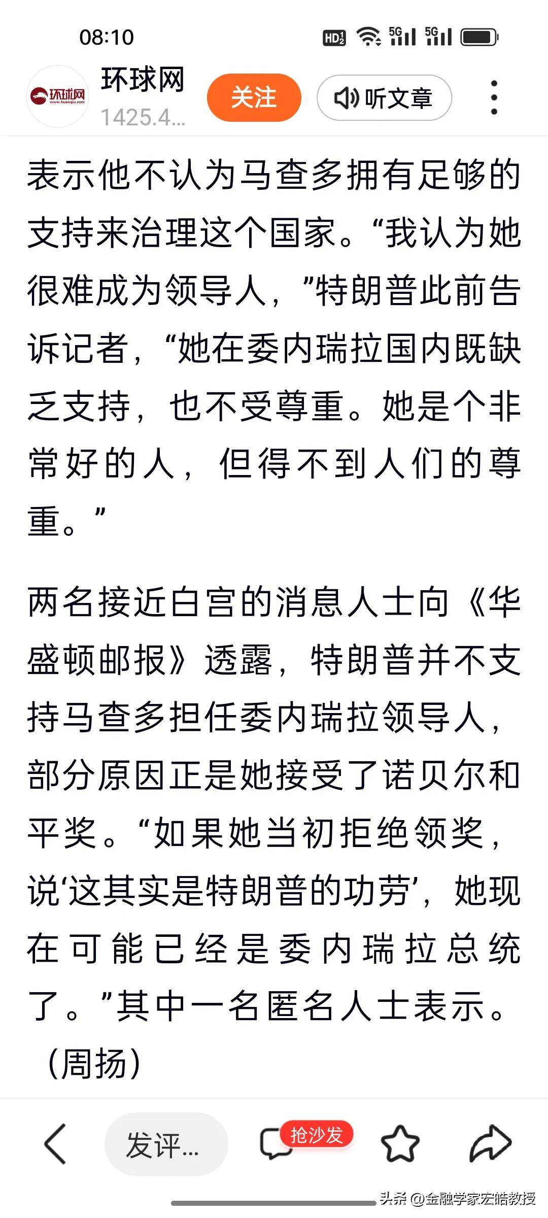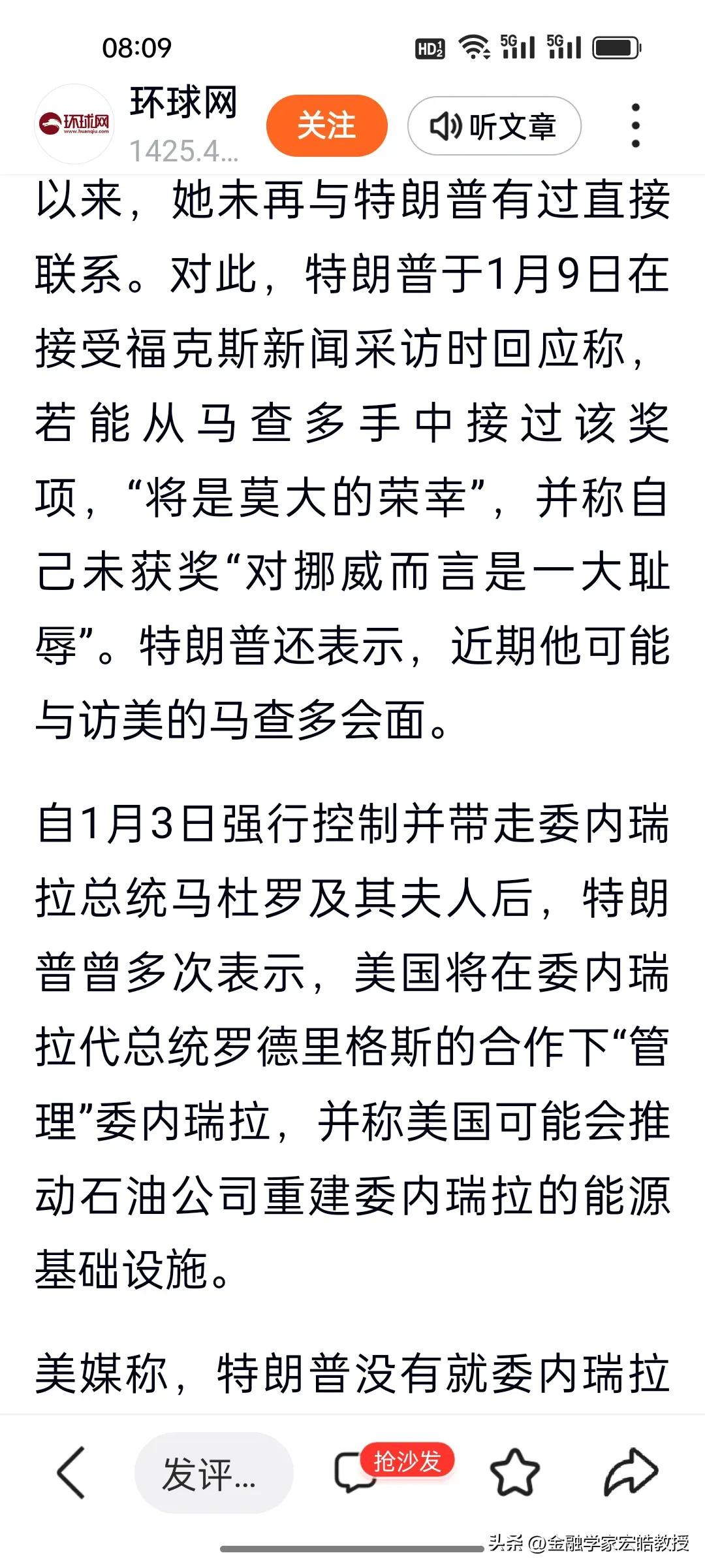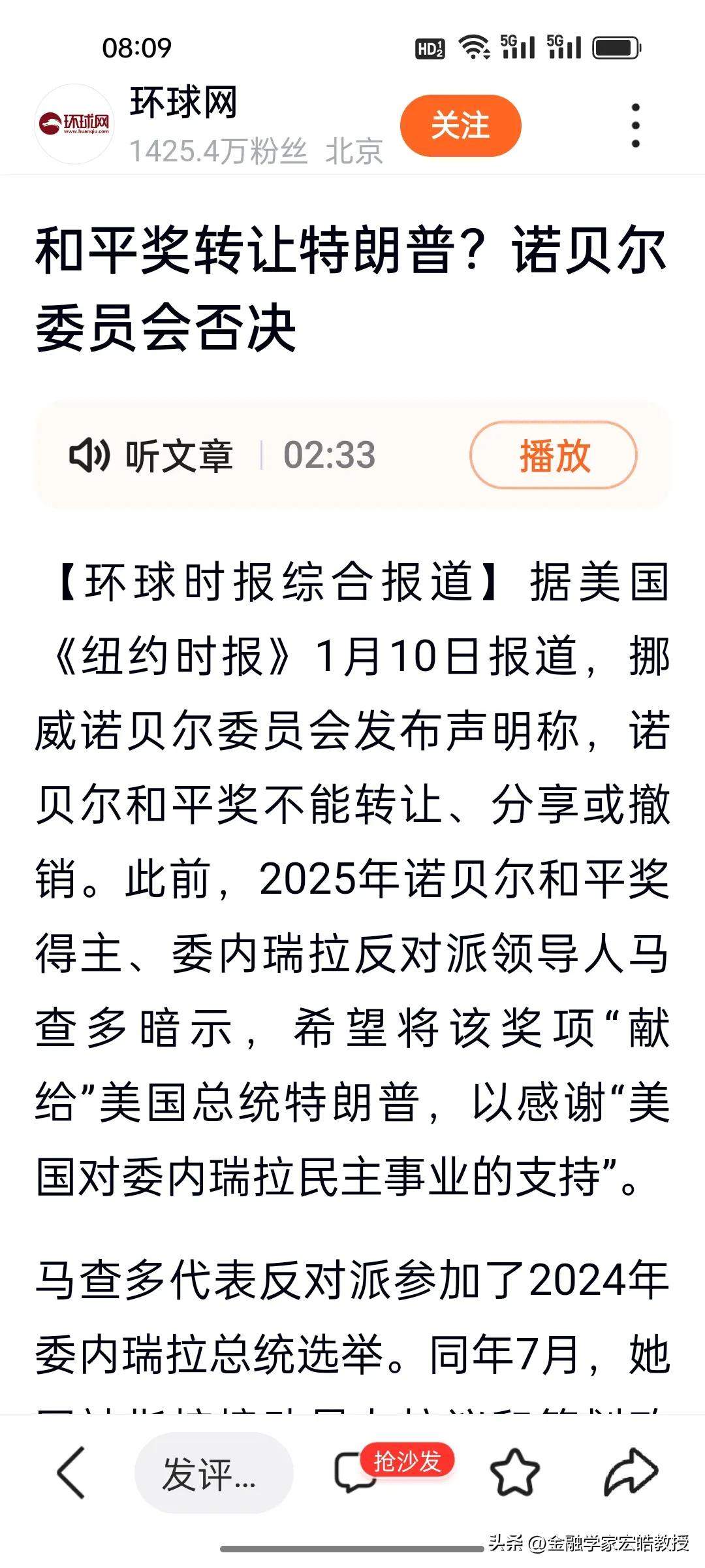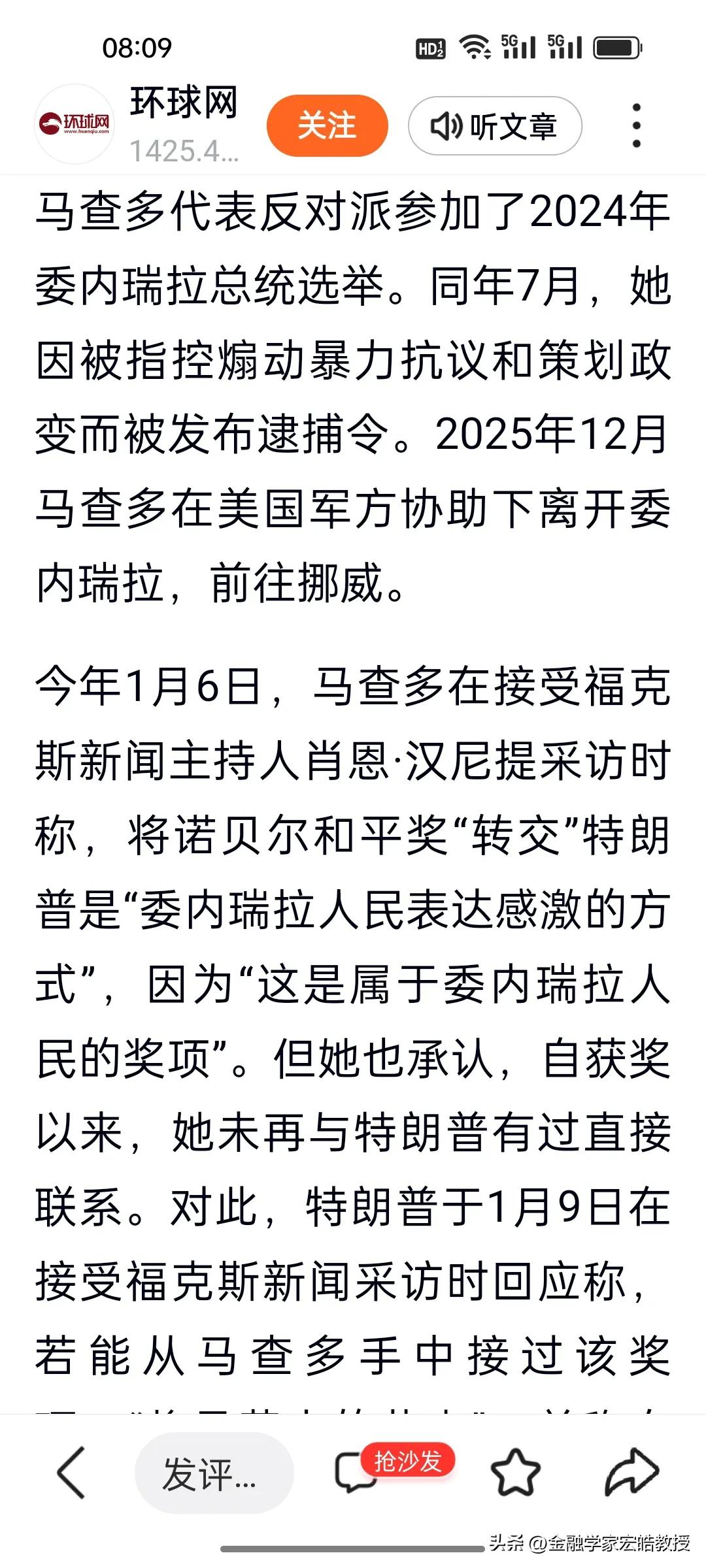 这是要闹诺奖史上最大笑话?特朗普竟要收下“转让”的诺贝尔和平奖,还称这是“莫大的荣幸”。 挪威诺奖委员会早明令奖项不可转让,可是马查多要亲手“颁奖”,特朗普向《福克斯新闻》表示,自己欣然笑纳这心心念念的荣誉。 有接近白宫的人士向《华盛顿邮报》表示,如果当初马查多拒绝领奖,而说这个奖应该是特朗普的。她也许早就坐上了委内瑞拉总统的位置,而不是特朗普发文要当委内瑞拉代总统。 马查多此举藏着三重算计:一是感谢美国推翻马杜罗政权的支持,二是讨好特朗普换取政治背书,三是弥补此前未拒奖的“过失”。 特朗普要是真的得到了这个奖,也绝非合规奖项,但马查多此举却戳破西方荣誉体系的脆弱。当规则向强权低头,这场私相授受的闹剧,不过是权力游戏的荒诞戏码!