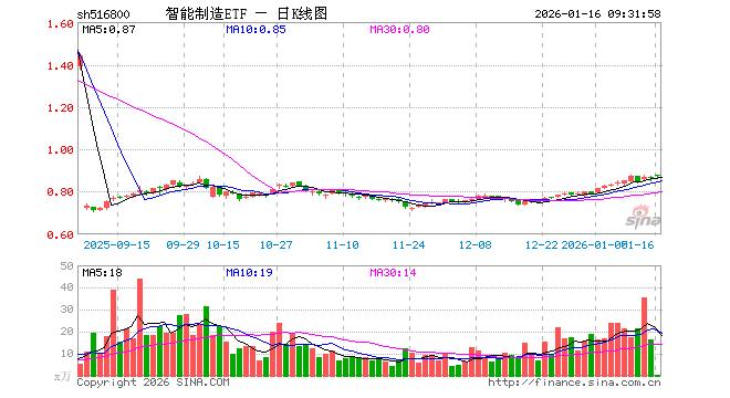 智能制造ETF(516800)业绩比较基准为中证智能制造主题指数收益率,管理人为华宝基金管理有限公司,基金经理为张放,成立(2021-01-29)以来回报为73.61%,近一个月回报为15.12%。