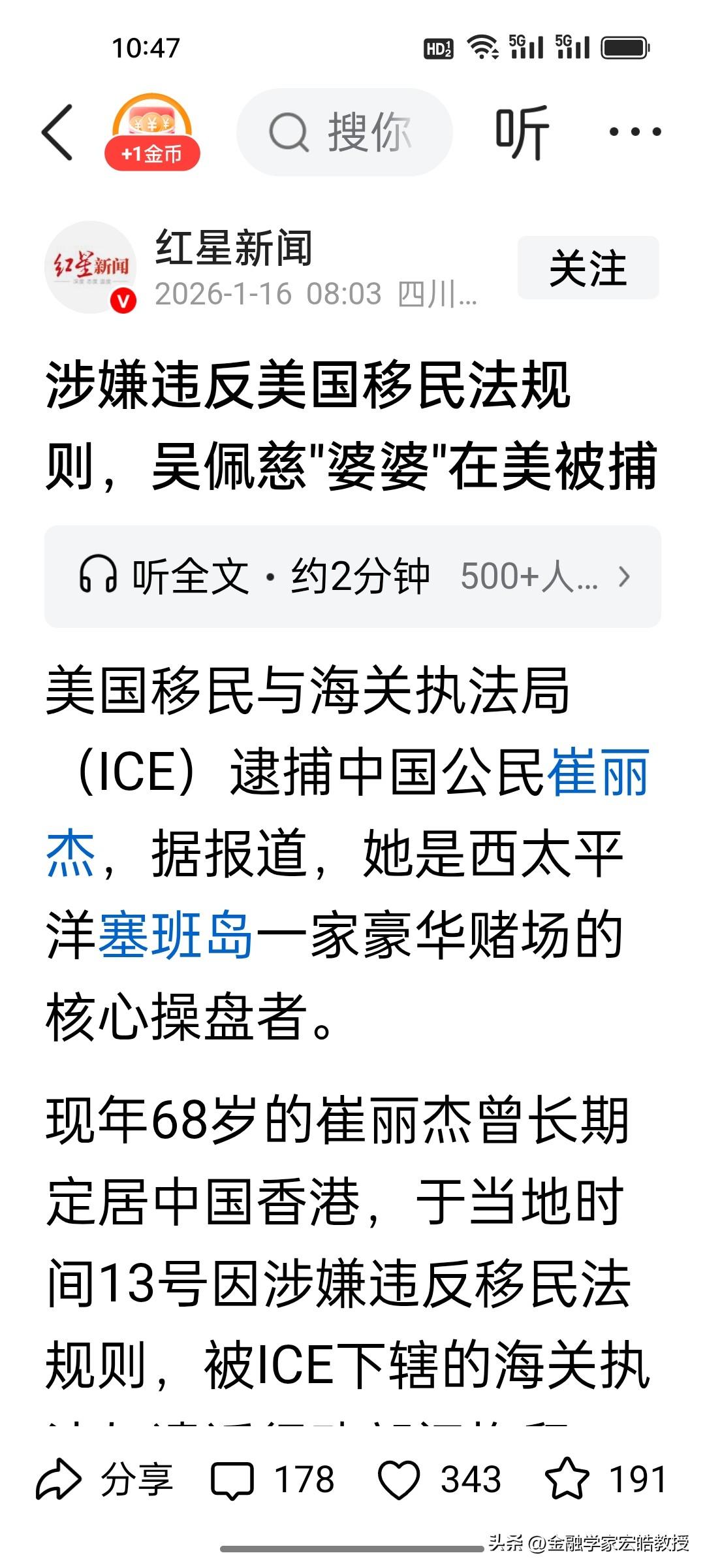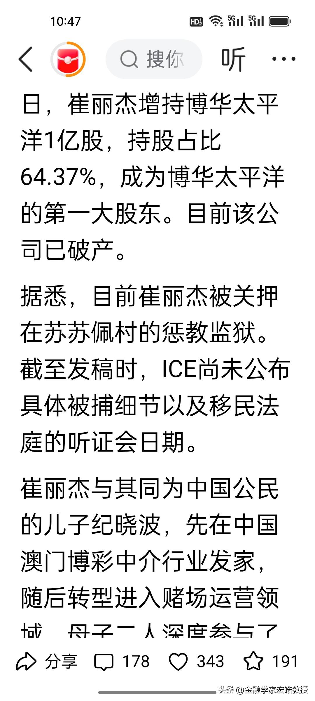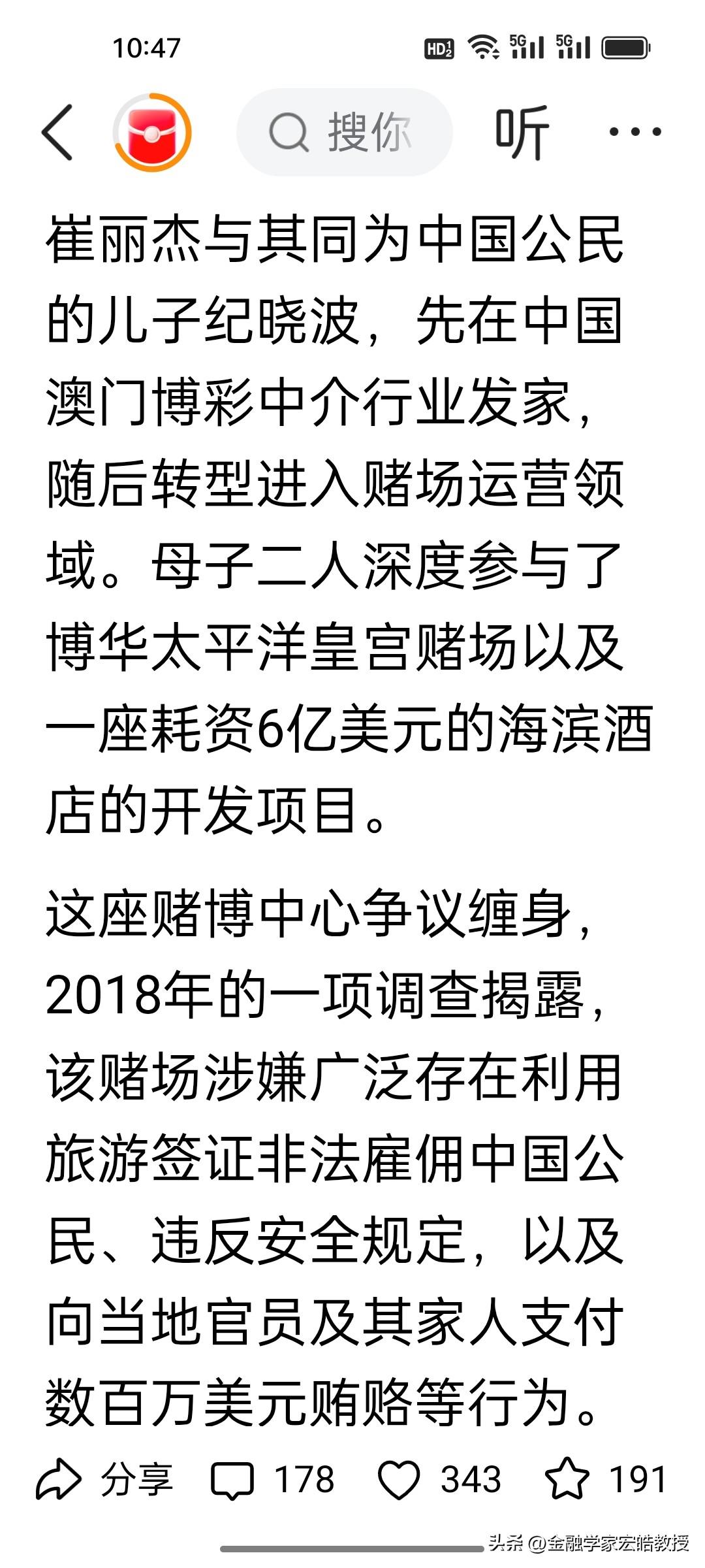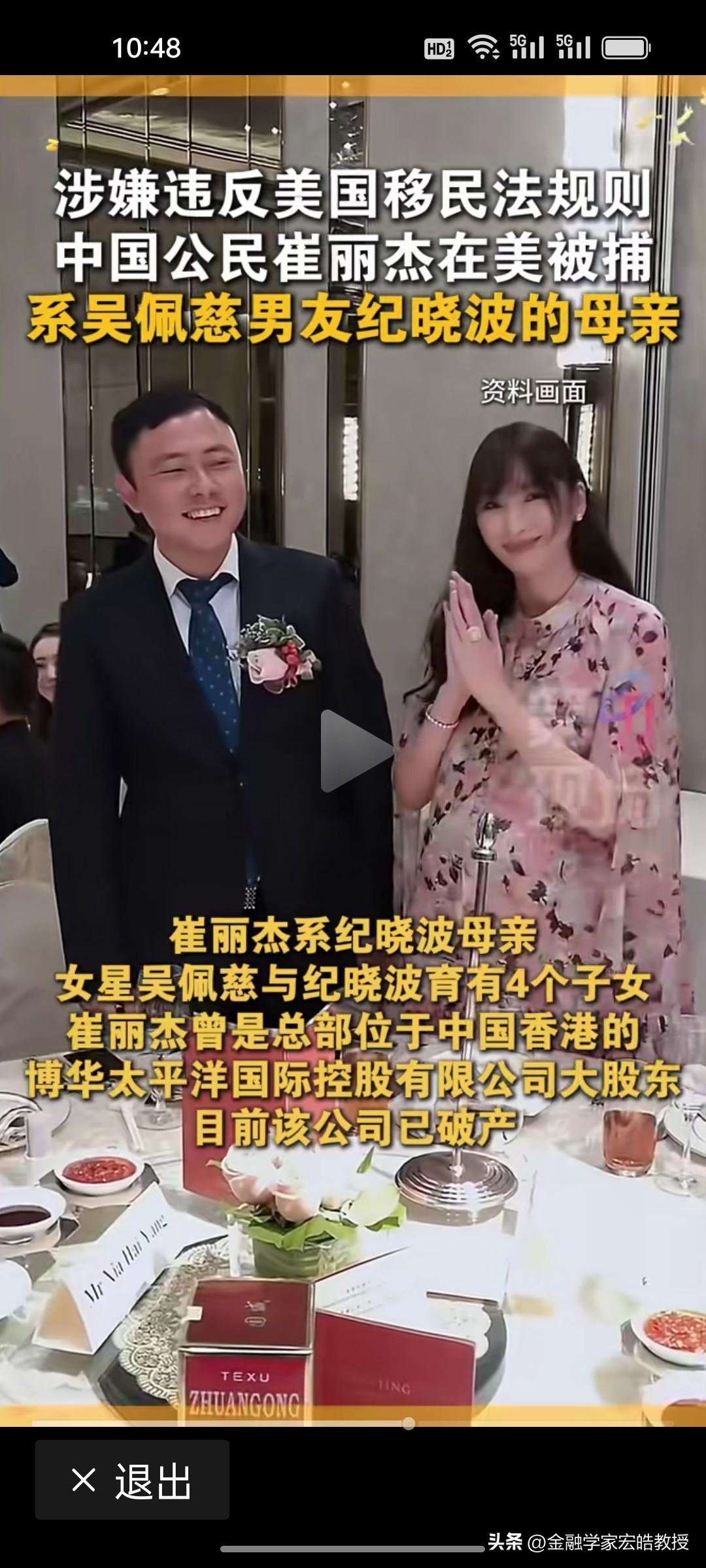 突发!吴佩慈婆婆崔丽杰在美被捕!纪晓波之前已经失踪,塞班赌场2020年崩盘,华人富豪再遭美国围剿! 长期居住在香港的纪晓波母亲,68岁崔丽杰因违反移民法被美国ICE逮捕,这位塞班岛赌业帝国的操盘手,如今身陷牢狱。其儿子纪晓波自被定性为“恶势力首脑”后便下落不明,网传遭FBI通缉却无实锤。 曾靠澳门叠码仔起家,巅峰时单月赌额超390亿港元,塞班赌场砸6亿打造却因行贿、非法雇佣暴雷,2024年破产负债1.658亿美元。从天上人间老板覃辉到华人首富赵长鹏,美国对华人富豪的精准打击屡见不鲜,这一次又将会是“磨刀霍霍”的巨额罚款。 吴佩慈这场豪门梦碎警示:不义之财终难守,跨境布局更需敬畏规则。现在的关键在于纪晓波会不会因为母亲被捕而现身?